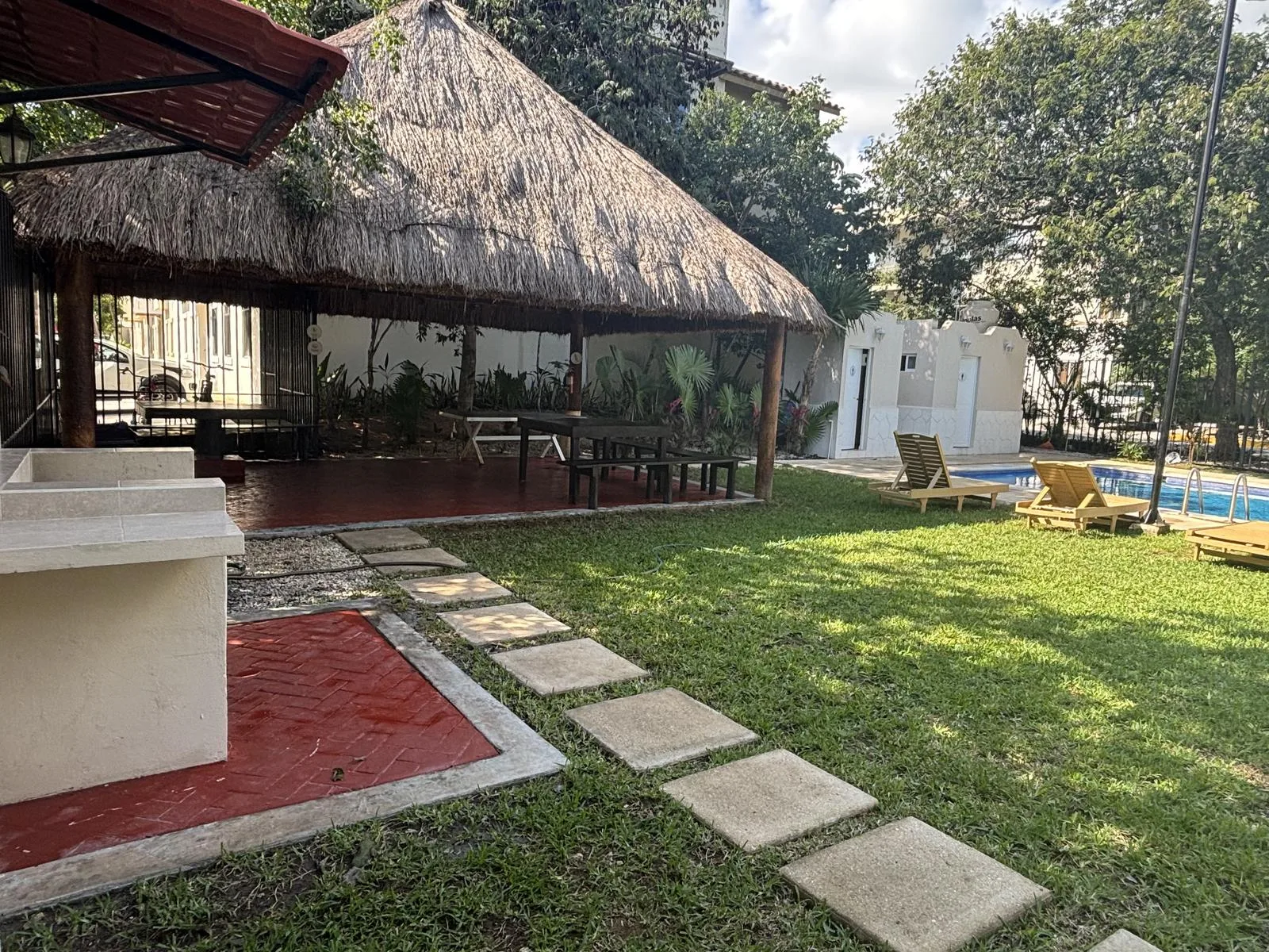 The residential complex offers amenities including a pool, a palapa, a barbecue area, visitor parking, bicycle space, and secure common family areas.