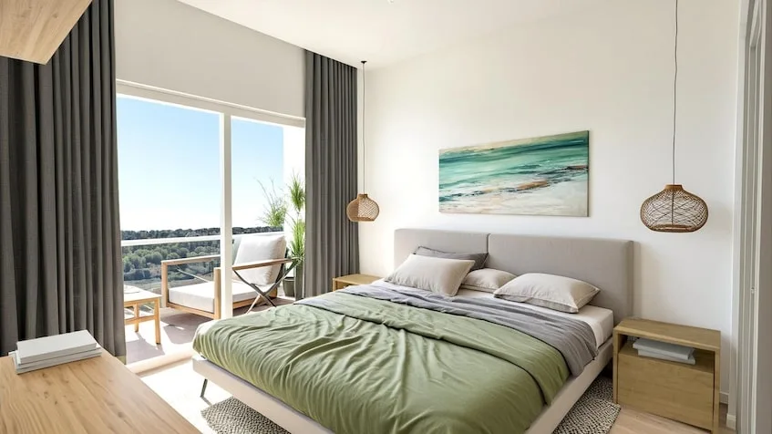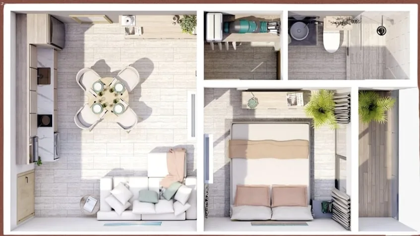 The development offers fully equipped 1- and 2-bedroom condos. The 1-bedroom condo spans 45 square meters and includes one bedroom, one full bathroom, a terrace, an equipped kitchen, a walk-in closet, a washer-dryer, and a storage room. The 2-bedroom condo covers 90 square meters and features two bedrooms, two full bathrooms, a terrace, a balcony, a living-dining area, a walk-in closet, a washer-dryer, a dishwasher, a range hood, a storage room, and a lock-off option.