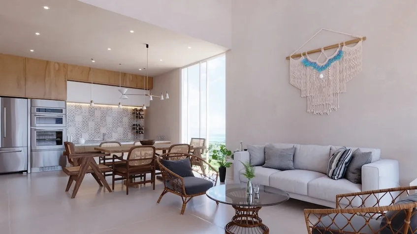 The project offers two- and three-bedroom apartments. Units are designed with high ceilings, ocean views, and spacious terraces, with the option of a private jacuzzi. One available typology is a 98 square meter two-bedroom apartment with two bathrooms, a living and dining area, and an equipped kitchen.