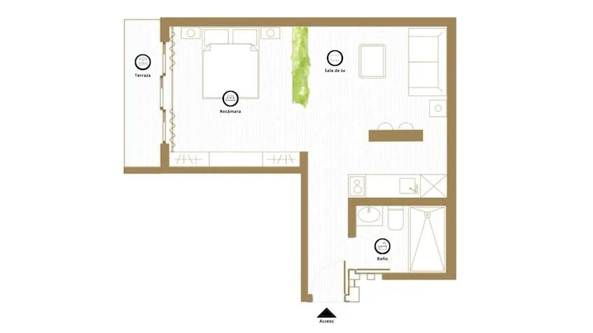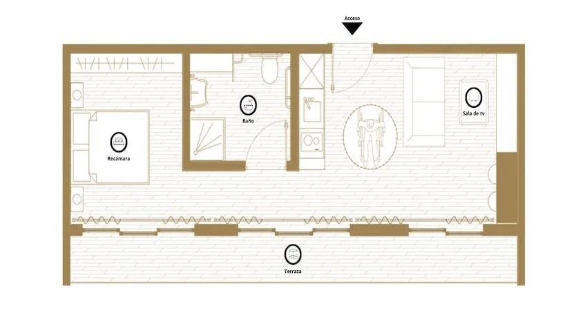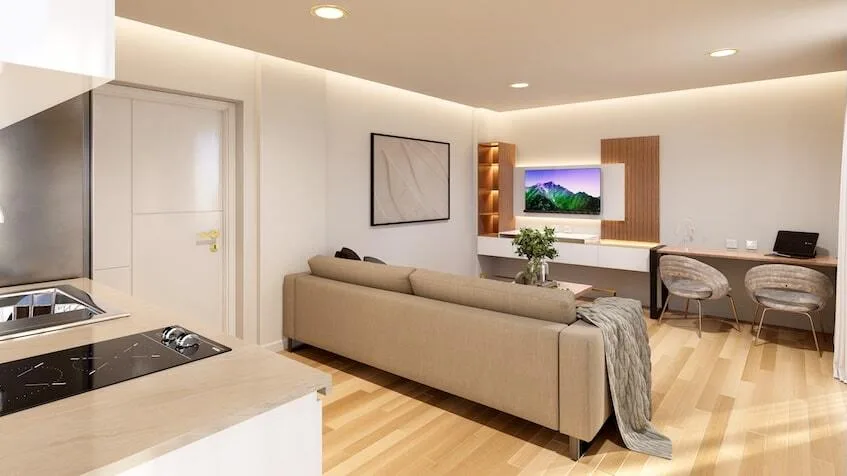Available unit typologies include studio apartments of 45 square meters with one full bathroom, an equipped kitchen, a combined living and sleeping area, and a terrace or balcony depending on the unit. One-bedroom apartments range from 41 to 50 square meters, depending on the model, and feature one bedroom, one full bathroom, a TV lounge, an equipped kitchen, and a terrace. All units are finished and fully furnished.