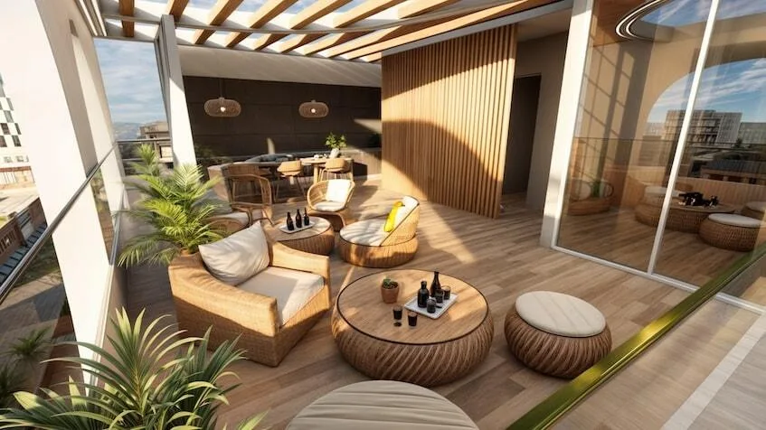 The property features elegant interiors, luxurious finishes, integrated smart home technology, and a strategic location. The development is distinguished by its spacious terraces, rooftop swimming pool, sports bar, green areas, and modern architecture with organic curves.