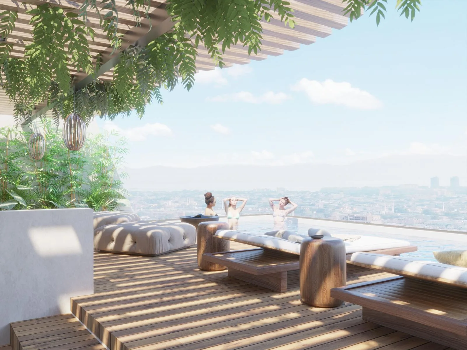 The building features a swimming pool, a jacuzzi, and sun loungers. Additional amenities include a Sky Bar, private parking, laundry facilities, a fitness center, and a rooftop terrace.