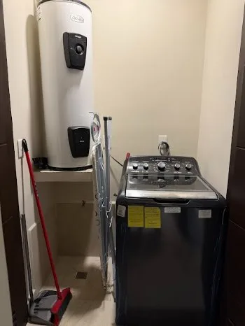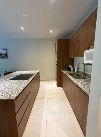 The unit features a living and dining room, an equipped kitchen, and three bedrooms with closets. There are two bathrooms, a laundry room, and a balcony. The residence includes four mini-split air conditioning units, custom carpentry, and a deeded parking space. The homeowners association fees are 1, 500 MXN.