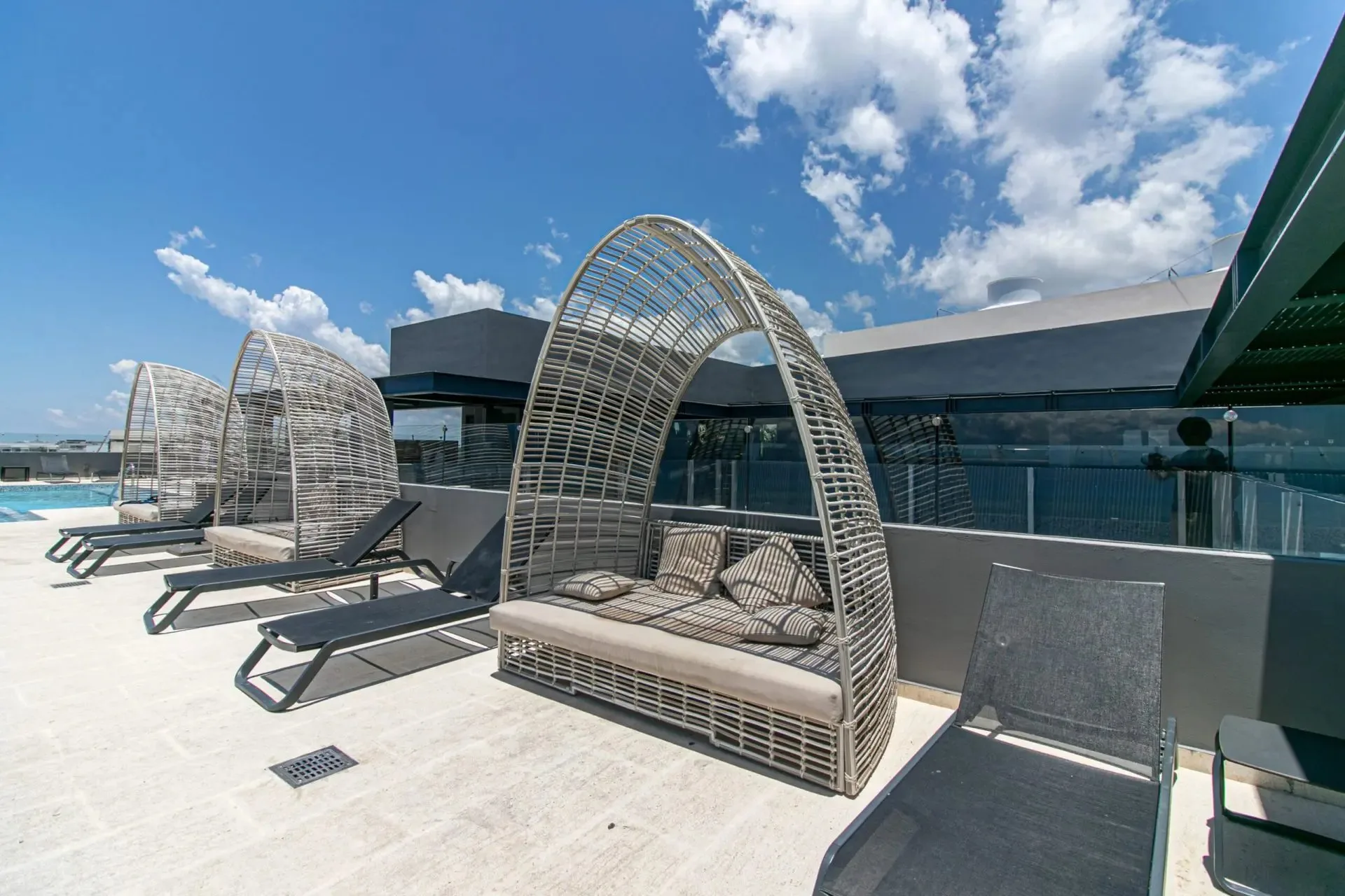 The building offers hotel amenities including a rooftop bar, three rooftop pools, a heated pool, a gym, a lobby, a laundry room, concierge services, a spa, room service, and a convenience store. The rooftop provides panoramic ocean views.