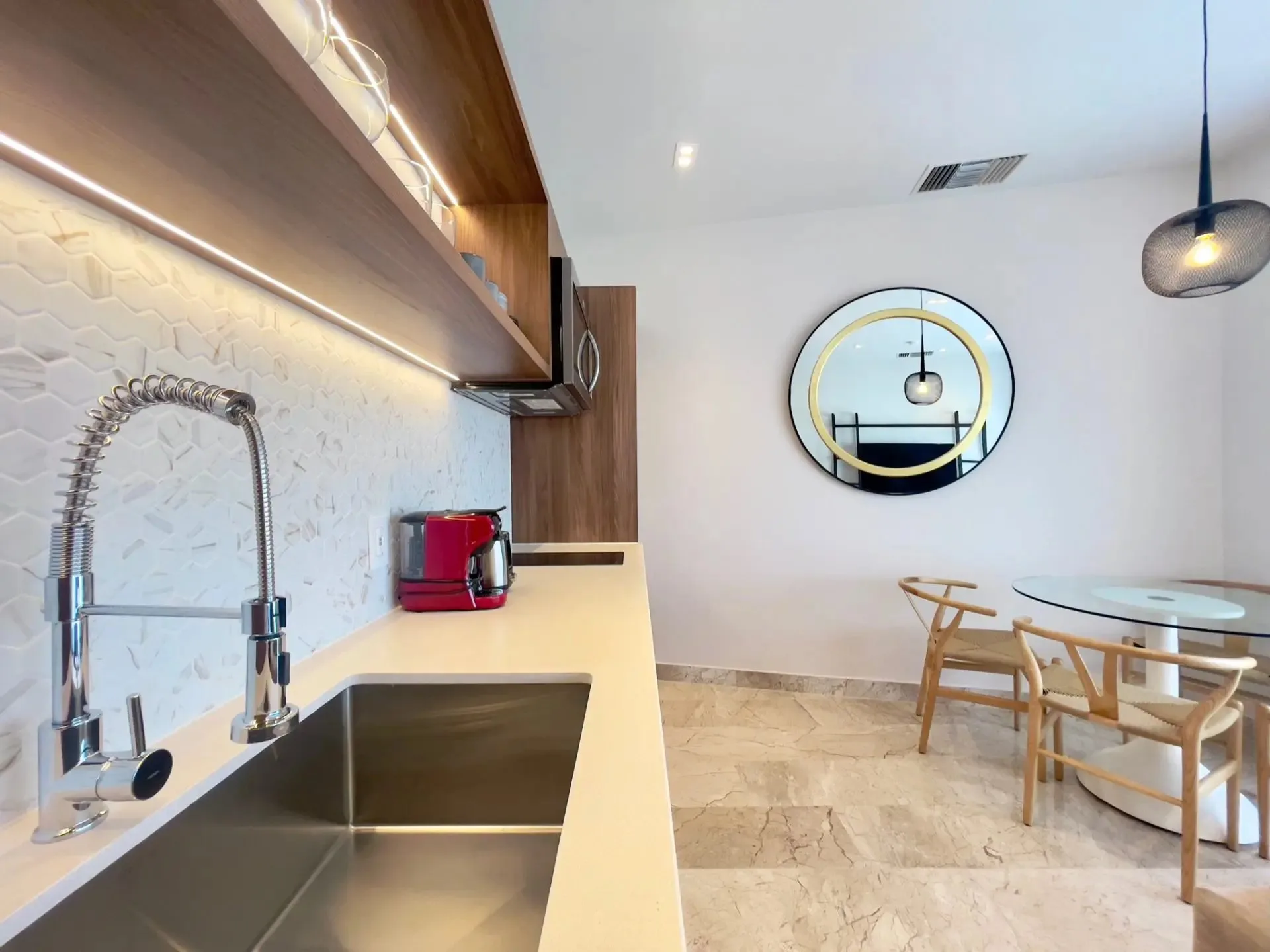 This perfectly arranged unit showcases high-end finishes and features an impressive rooftop with ocean views. It is fully furnished and equipped. A spacious balcony provides stunning views of the sunrise over Playa del Carmen.
