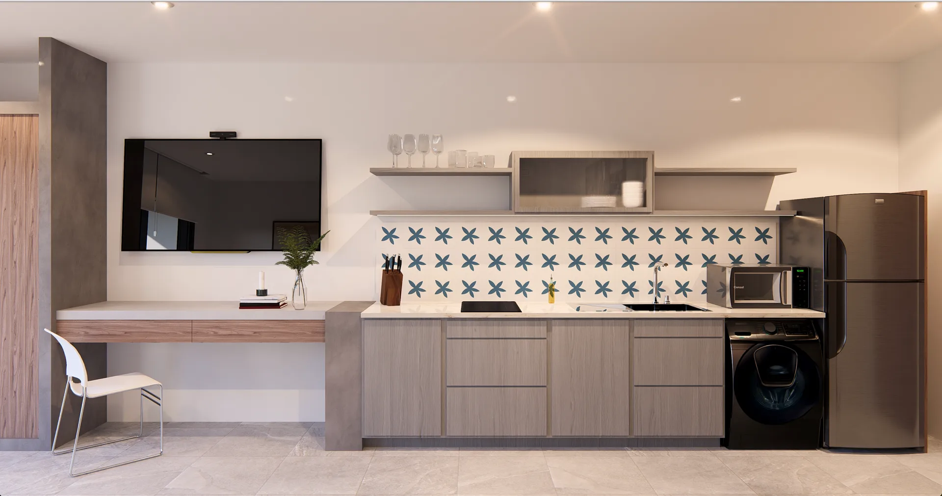 Each studio is equipped with a king size bed, two nightstands, a sofa bed, air conditioning, closets, appliances, kitchen utensils, a dining set for two, and a washer-dryer.