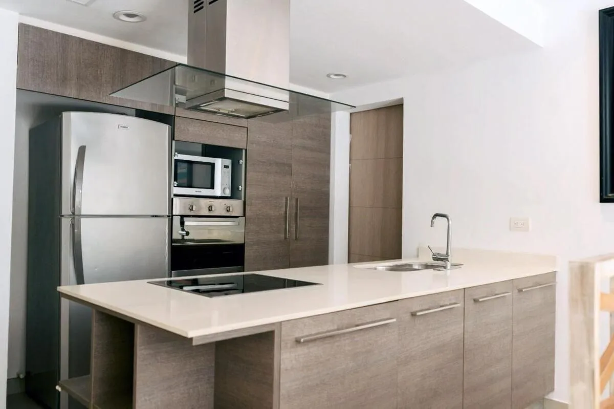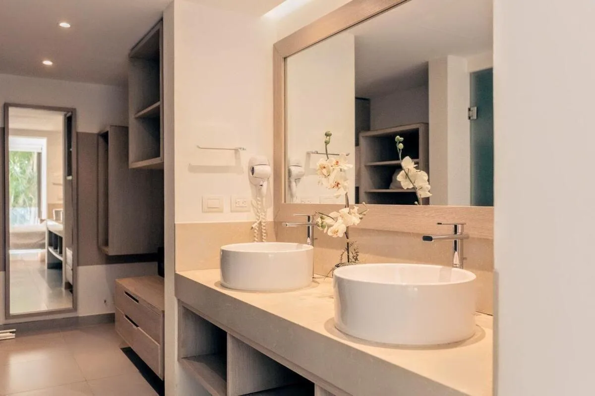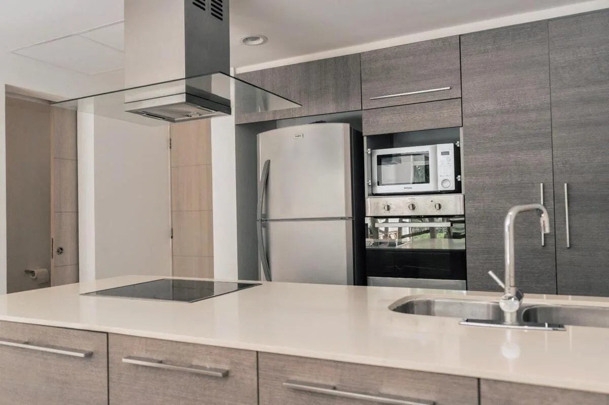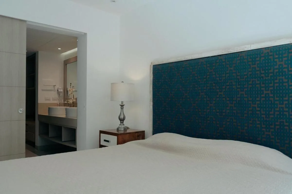 The layout includes two spacious bedrooms with excellent natural light and two fully modern bathrooms. The residence features a private terrace with direct access to the pool area. The unit includes one dedicated parking space.