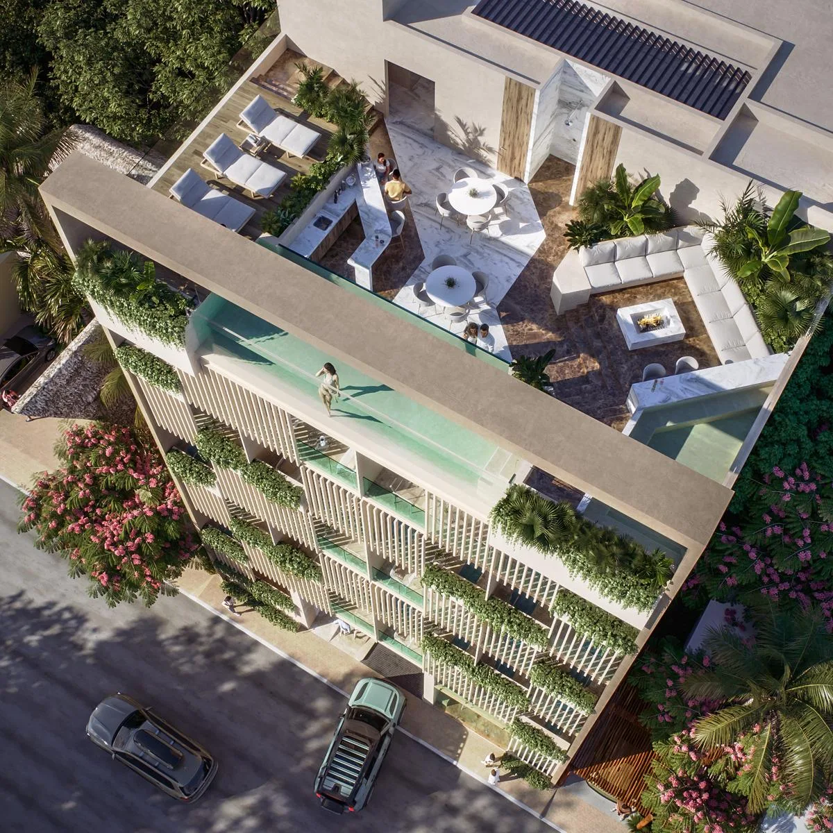 The building features a welcoming lobby, a fully equipped gym, and a coworking space for remote work. Residents can enjoy a dedicated coffee bar, a sky bar for socializing, and an infinity pool with sunset views.