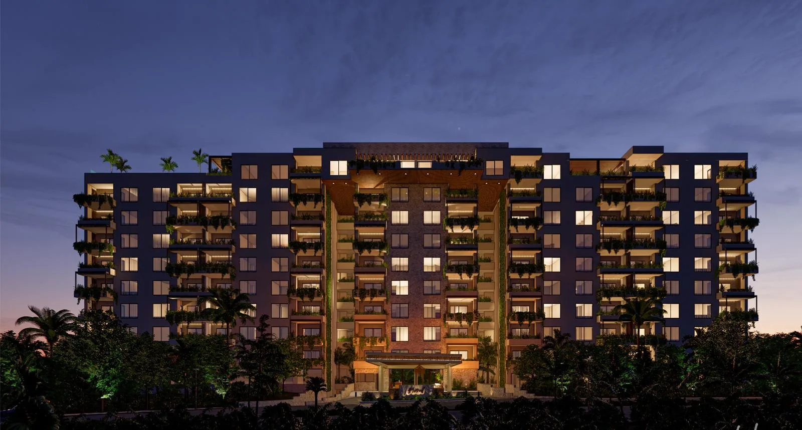 The building features a lobby with 24/7 security. Residents have condominium beach access and access to a condominium app. Amenities include a business center, a vehicle charging station, a convenience store, and covered parking. There are multiple bars: a restaurant bar, pool bar, sports bar, and rooftop bar. Additional facilities include a professional gym, a rooftop with a pool and sea view, an entertainment area, and an artificial cenote. Outdoor amenities comprise a main pool, a children's pool, a swimming lane, jacuzzis, a hammock area, a grill area, and a fire pit.
