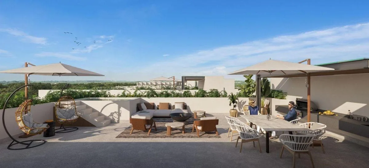 The unit is designed with premium finishes and spacious areas, featuring a private terrace and a fully equipped contemporary-style kitchen. The location is near Fifth Avenue, golf courses, and the Caribbean's best beaches.