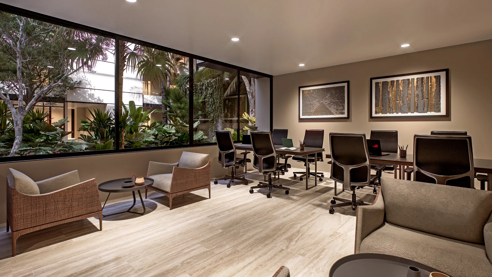 For recreation, there is a safe and fun kids' club designed for children to explore and enjoy creative activities. A fitness center is equipped with modern technology and offers views of the central garden, blending physical health with natural beauty. A coworking space combines functionality and style, providing a peaceful area with natural views, ideal for balancing work and private life.