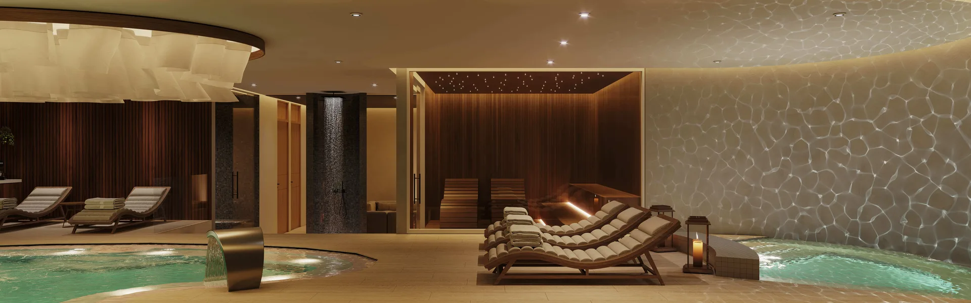Building amenities include a lobby with concierge service, a spa, and a rooftop area. The rooftop features a pool with panoramic views, a jacuzzi, and a fire pit. The property includes a parking lot.