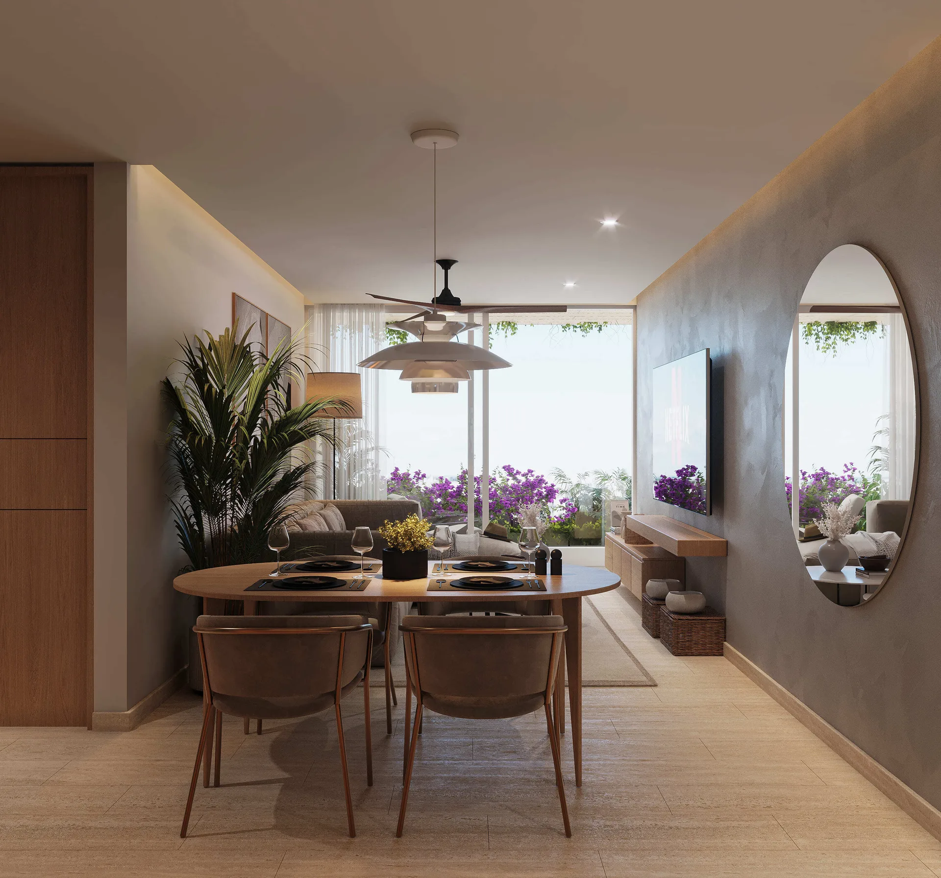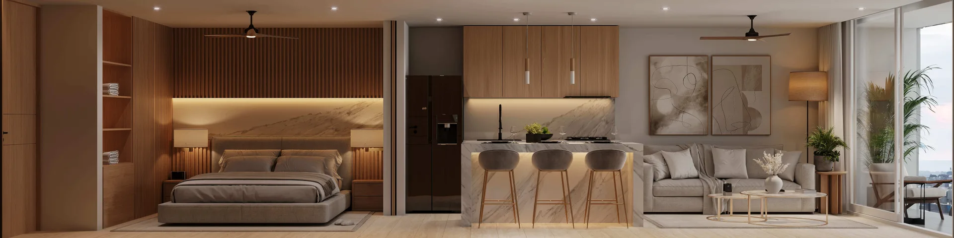 The development features high-end units with one or two bedrooms. Many units offer views of the sea or the nearby city park.