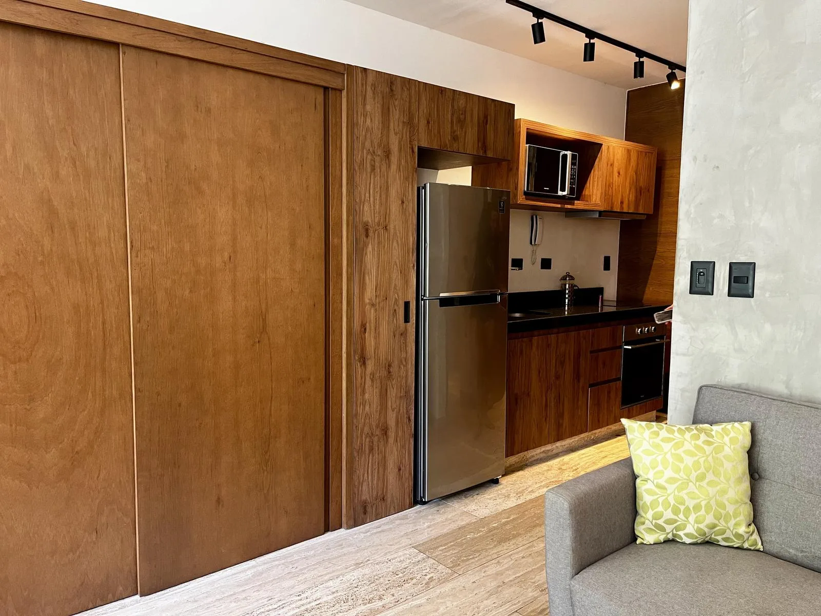 The unit features a complete integrated kitchen with a large refrigerator and oven, a king-size bed, and a balcony facing Calle 26.