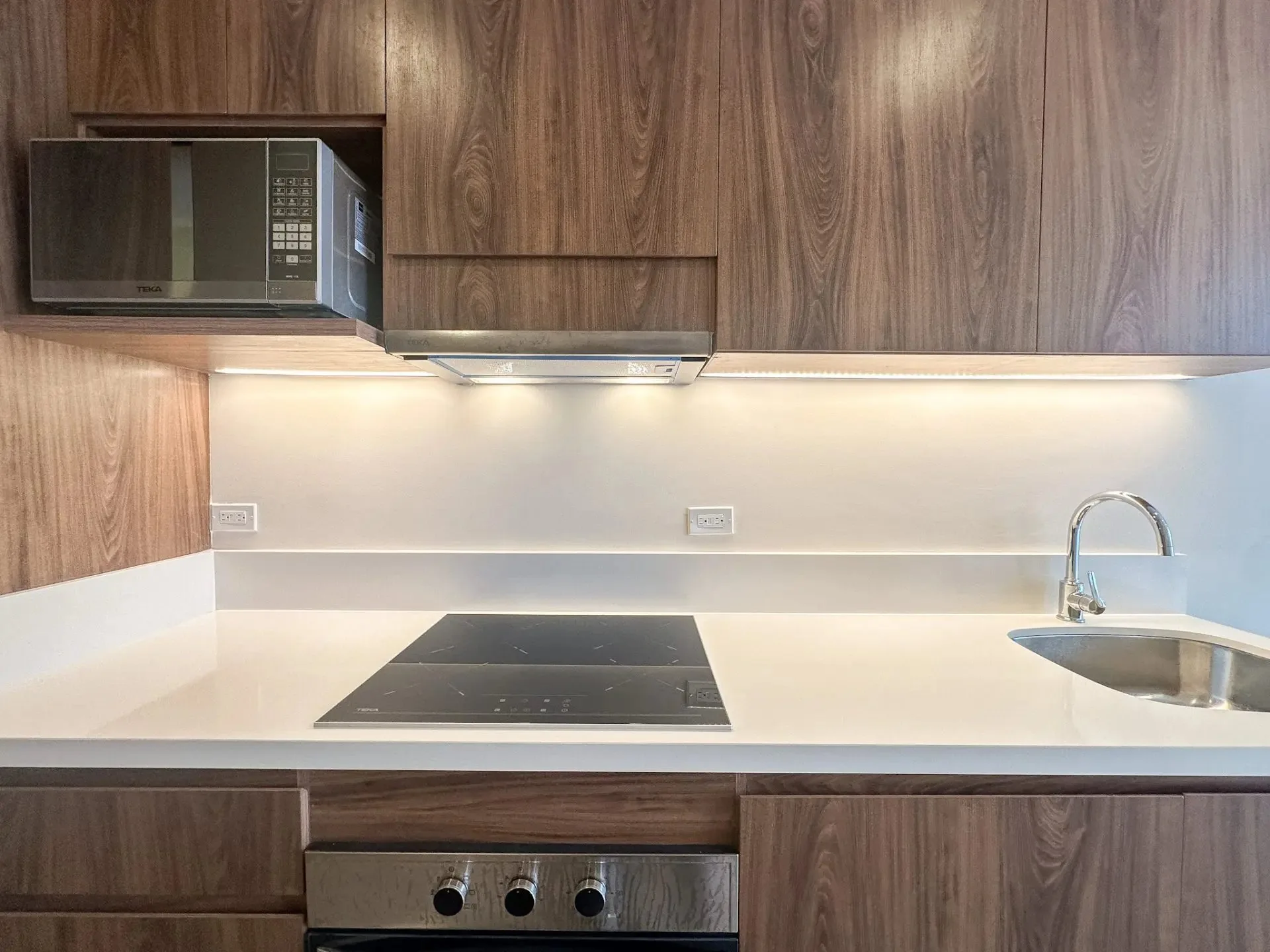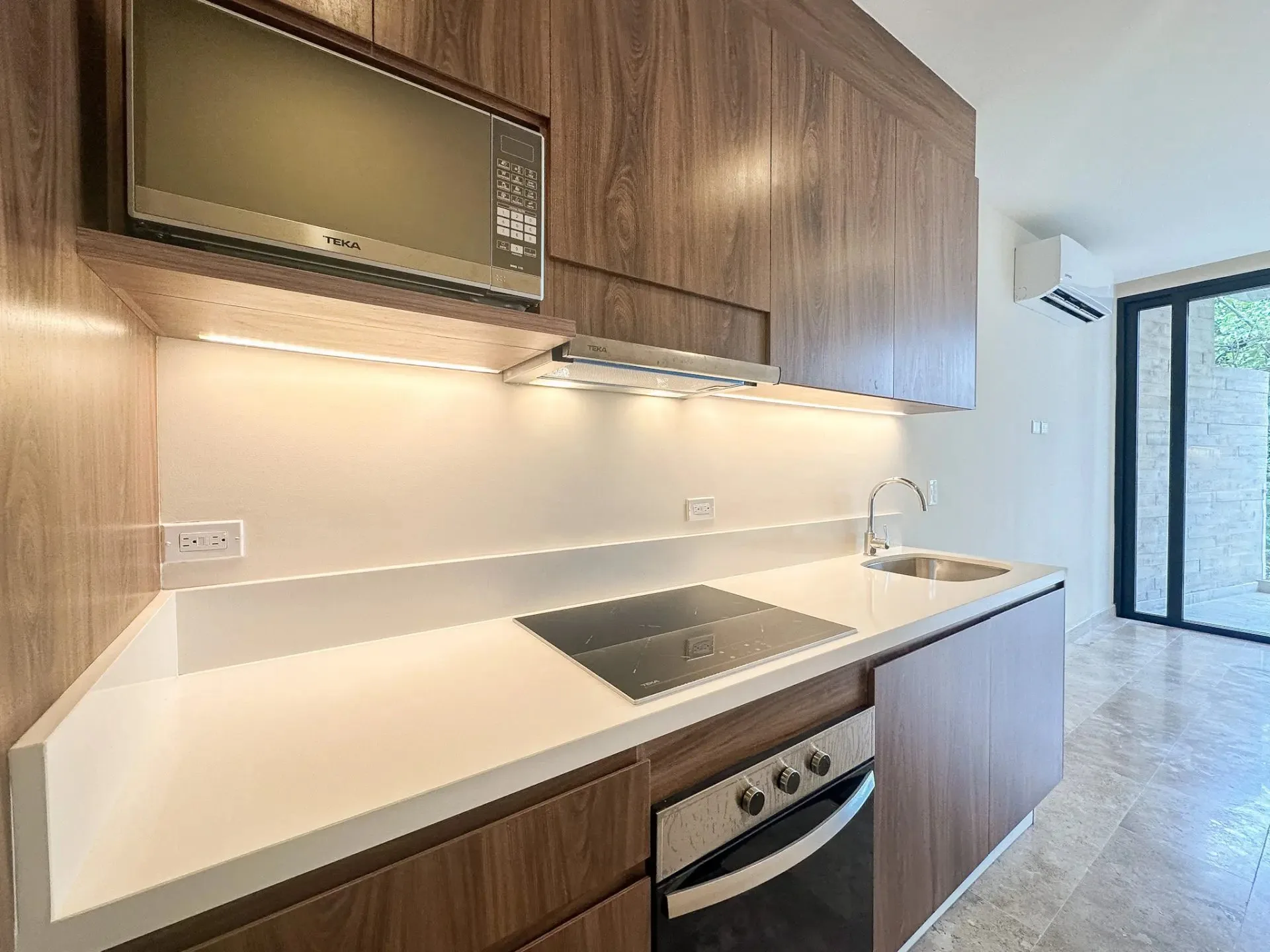 The condo features a practical and efficient layout with an open feel. The kitchen includes an electric stove, electric oven, microwave, and refrigerator. Minisplit air conditioning is installed throughout. A private balcony offers green views of the surrounding vegetation.