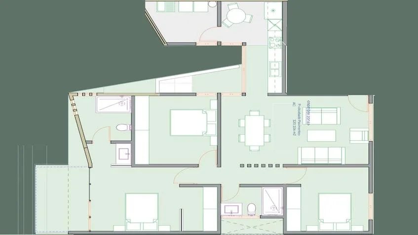 Available unit types include two-bedroom apartments starting from 91. 5 square meters and three-bedroom apartments starting from 120 square meters. The two-bedroom layout includes two full bathrooms, a living and dining room, an equipped kitchen, a laundry area, and a balcony. The three-bedroom layout offers two full bathrooms, a living and dining room, an equipped kitchen with a bar counter, a laundry area, and a balcony.