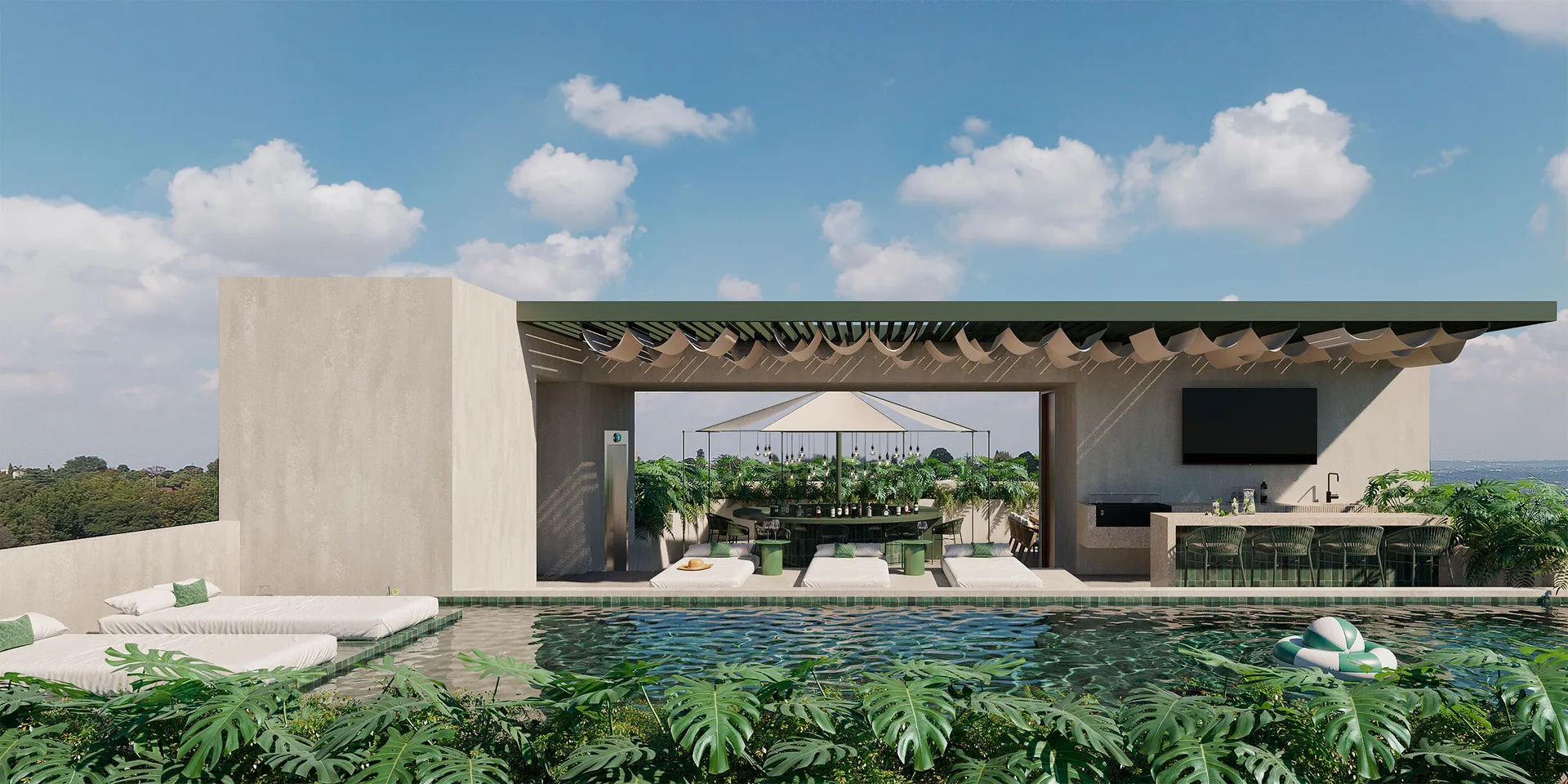 The development comprises 20 exclusive apartments across six levels plus a rooftop. Building features include an elevator servicing all floors from the ground to the rooftop, access control, and covered parking. Common areas include an open wellness space, a swimming pool with a pool bar and grill area, and sun decks.