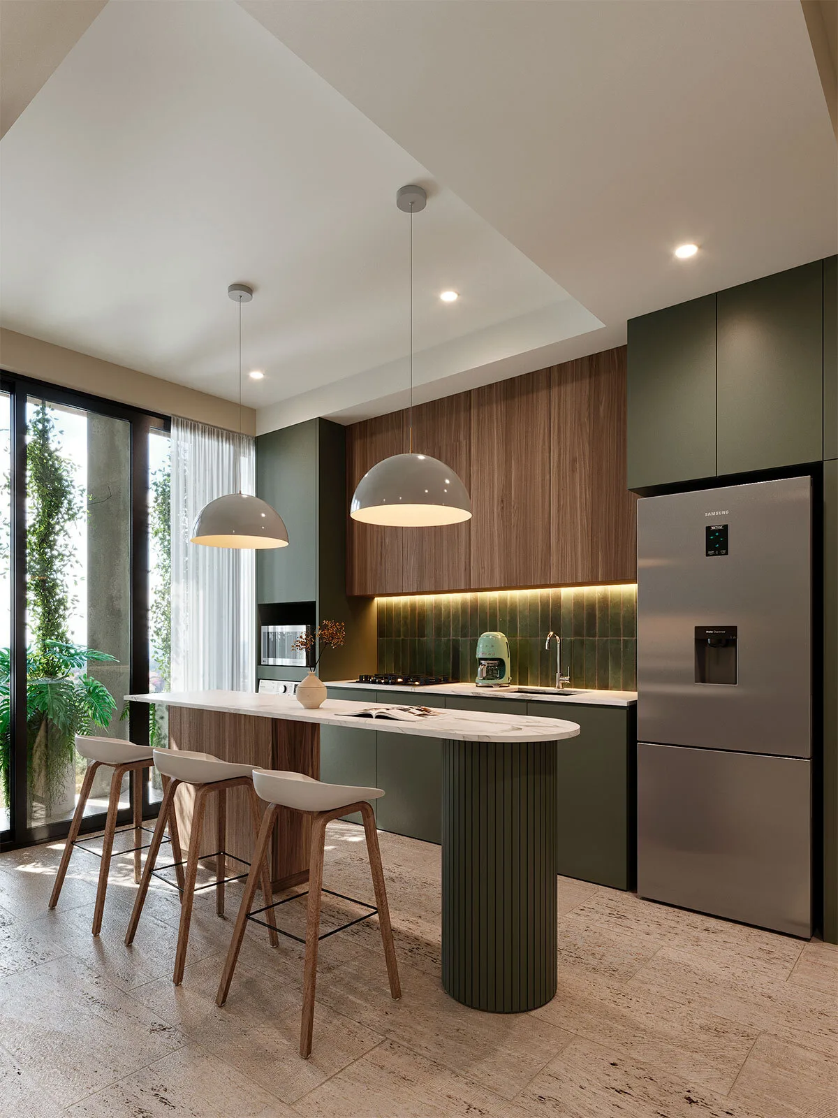 High-quality finishes are featured throughout. Polished marble-like floors are installed in the interior, bathrooms, and terraces. Quartz-type laminate is used for kitchen countertops. Green ceramic tile is present in showers, the grill bar, and the pool area. Doors and furniture utilize MDF in green melamine and natural wood finishes. Exterior walls showcase exposed concrete, and the facade incorporates hanging vegetation. The grill area flooring is grey terrazzo. The combination of natural materials, earthy colors, and vegetation provides a modern, fresh design in harmony with the tropical environment.