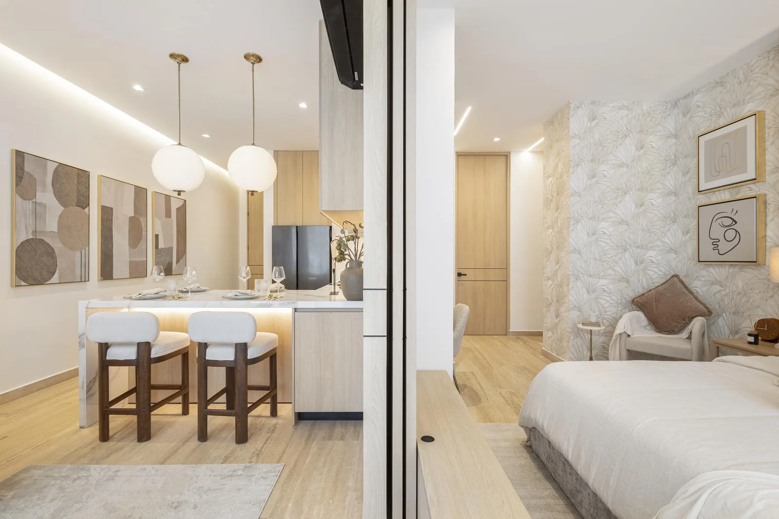 The building provides 24/7 concierge and security with controlled access from the park and Calle 26. The main entrance features double-height ceilings. A business center and coworking space includes a 75-inch HD screen. A fully equipped spa includes a sauna, aromatherapy room, hydrotherapy pool, and cold plunge pool.