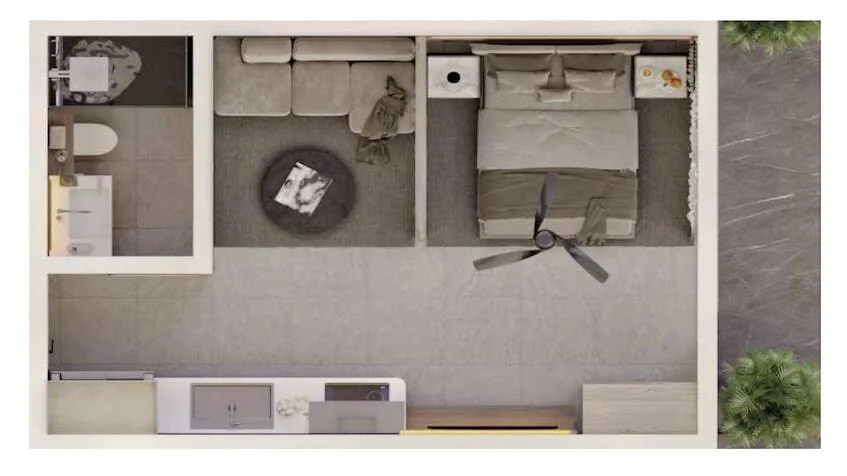 Available unit types include two-bedroom condos and studios. The two-bedroom condos contain two full bathrooms, a combined living and dining area, an equipped kitchen, and a terrace. The studio units feature a combined living-dining area, an equipped kitchen, and one full bathroom.