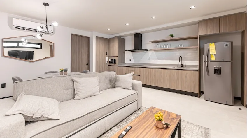 The location is strategic, close to the beach, Fifth Avenue, and major commercial zones, offering excellent connectivity. Points of interest nearby include the beach, a two-minute proximity, and Fifth Avenue, approximately three minutes away. The Cancun International Airport is about 45 minutes away, the Cozumel ferry is five minutes, the Quinta Alegría shopping mall is four minutes, and the ADO bus terminal is six minutes.