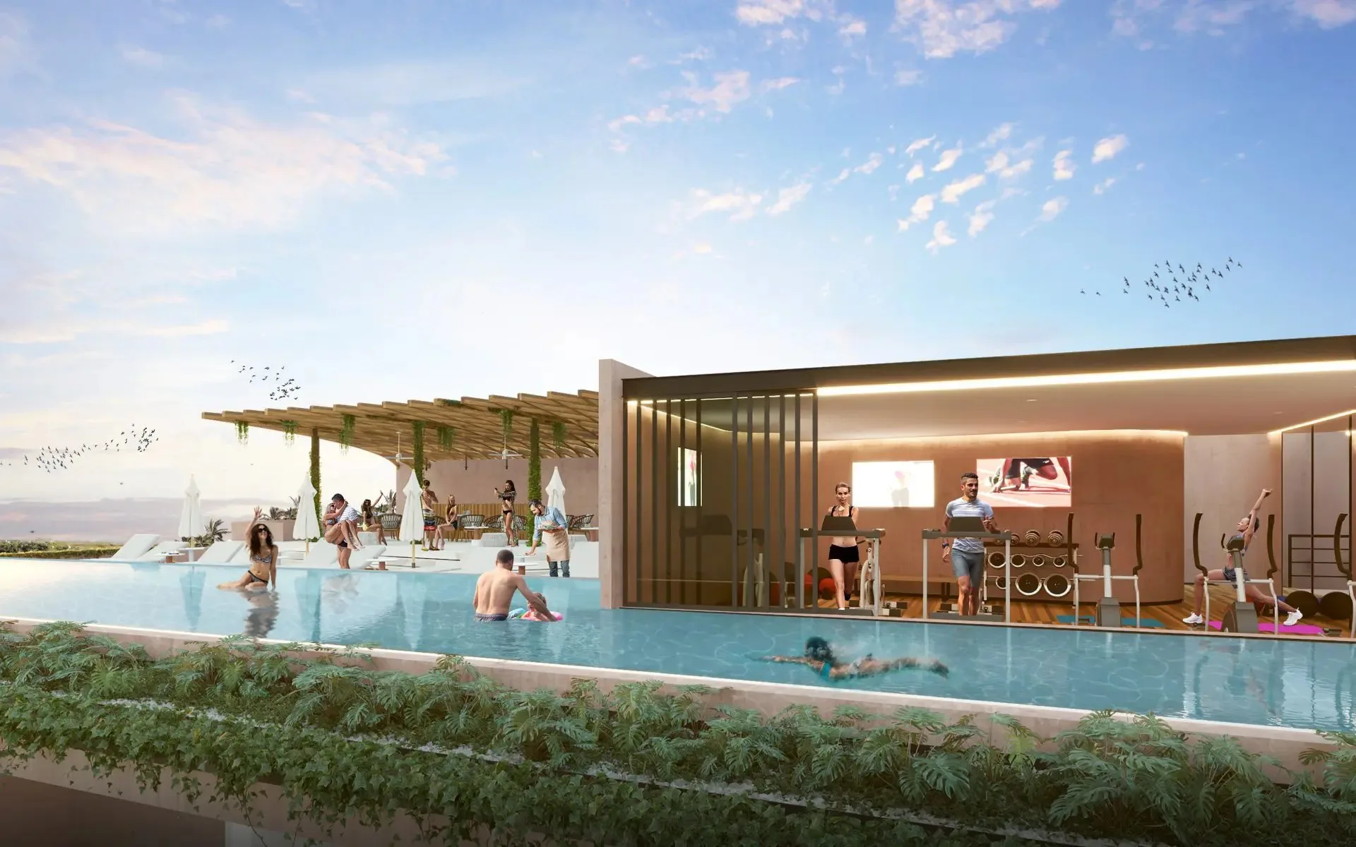 The building includes a controlled-access lobby on the ground floor, along with parking. The rooftop features a swimming pool, sun loungers, a grill area, a skybar, a fitness center, and a coworking space.