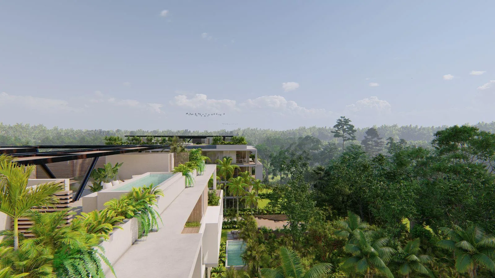 This residential community is situated within seventy thousand square meters of preserved jungle, with over forty thousand square meters dedicated to green areas and amenities. The master plan is characterized by low density, fostering a harmonious environment surrounded by nature.