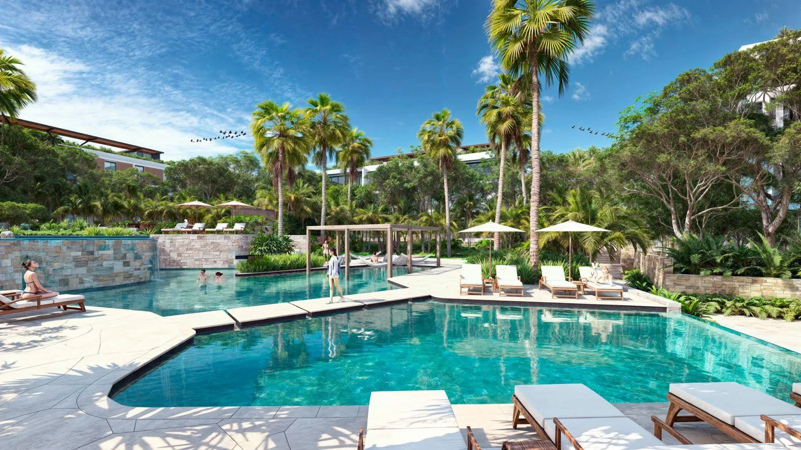 The development's onsite amenities include private landscaped areas, pool access, a waterfall, a wet sunbathing area, a children's pool, hammocks over water, a pergola, lounge areas, a hammock garden, and a jacuzzi.