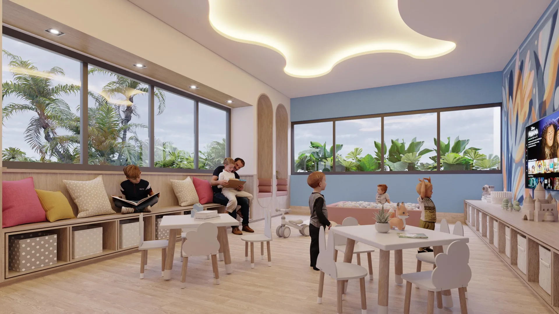 Residents have access to over twenty amenities. These include a panoramic rooftop pool with a jacuzzi and sauna, a fully equipped gym, a modern coworking space, a Kids Club, and an exclusive pet area. The building provides underground parking and 24-hour security.