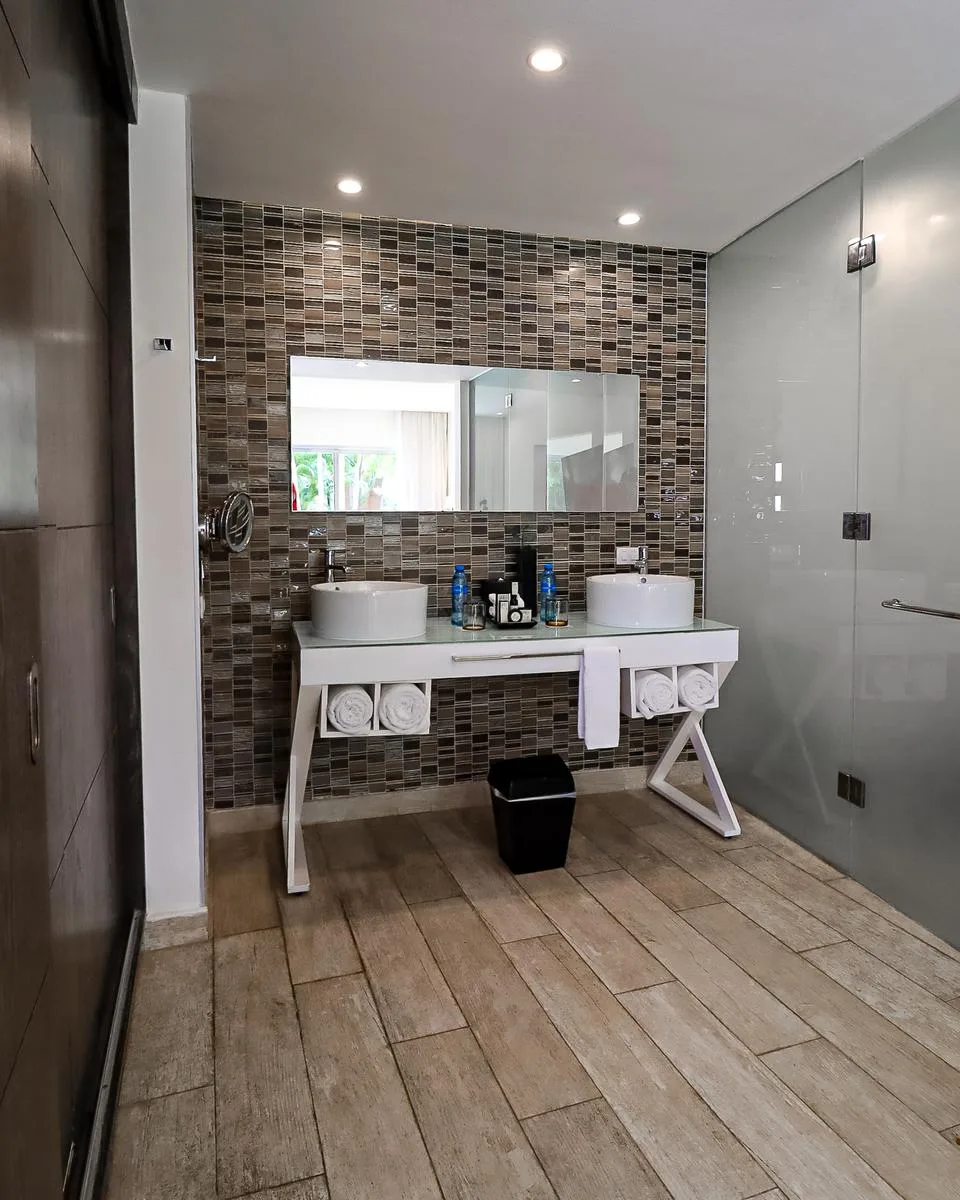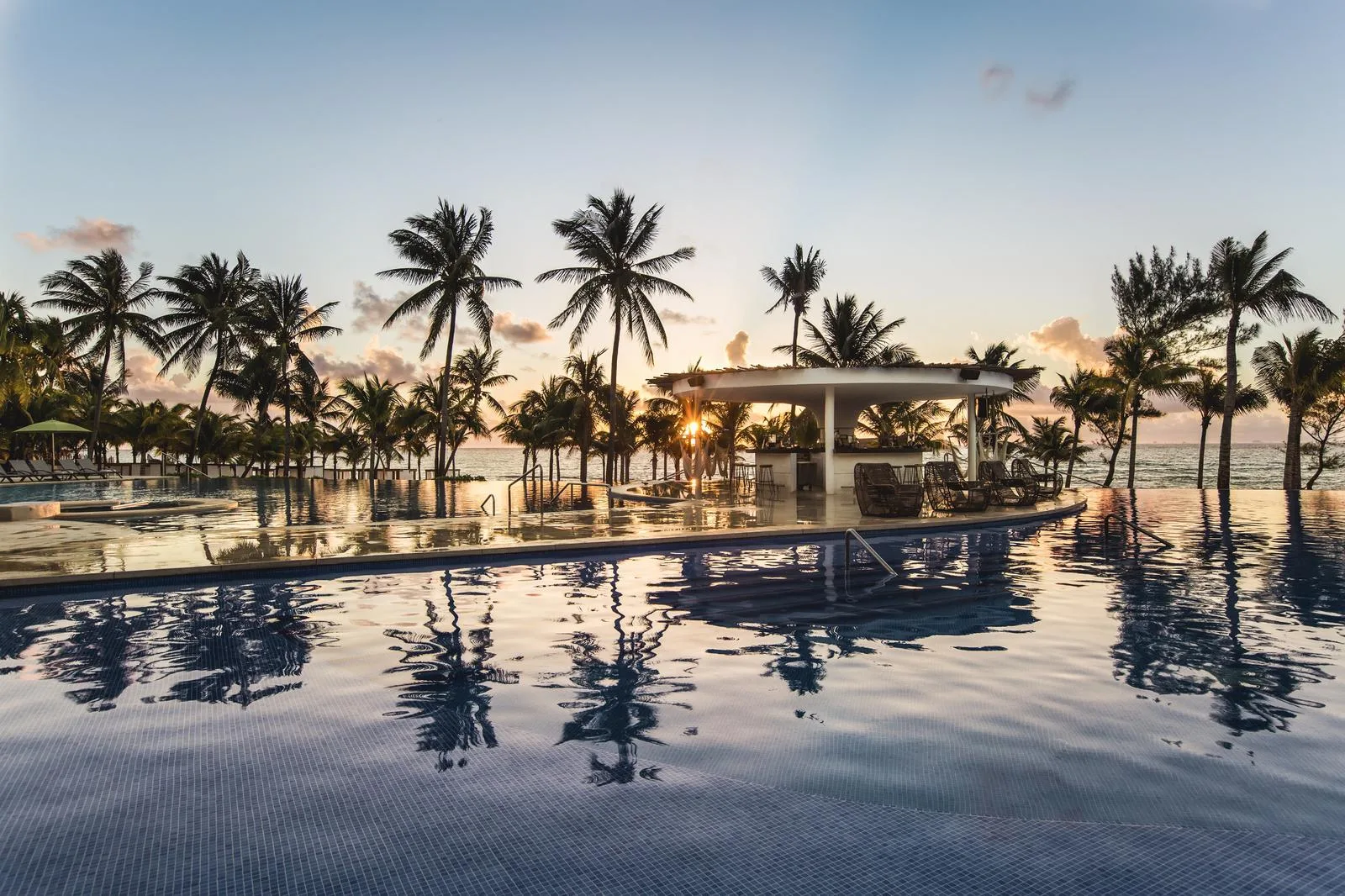 Resort amenities include a private beach club with Caribbean views, seven swimming pools including two infinity pools, fifteen gourmet restaurants, and nine exclusive bars. Additional facilities consist of a full-service spa, a fully equipped gym, tennis and basketball courts, a kids' club, and a dedicated teen game room. The complex also features a Marley Coffee shop and The Fives Plaza with commercial options.