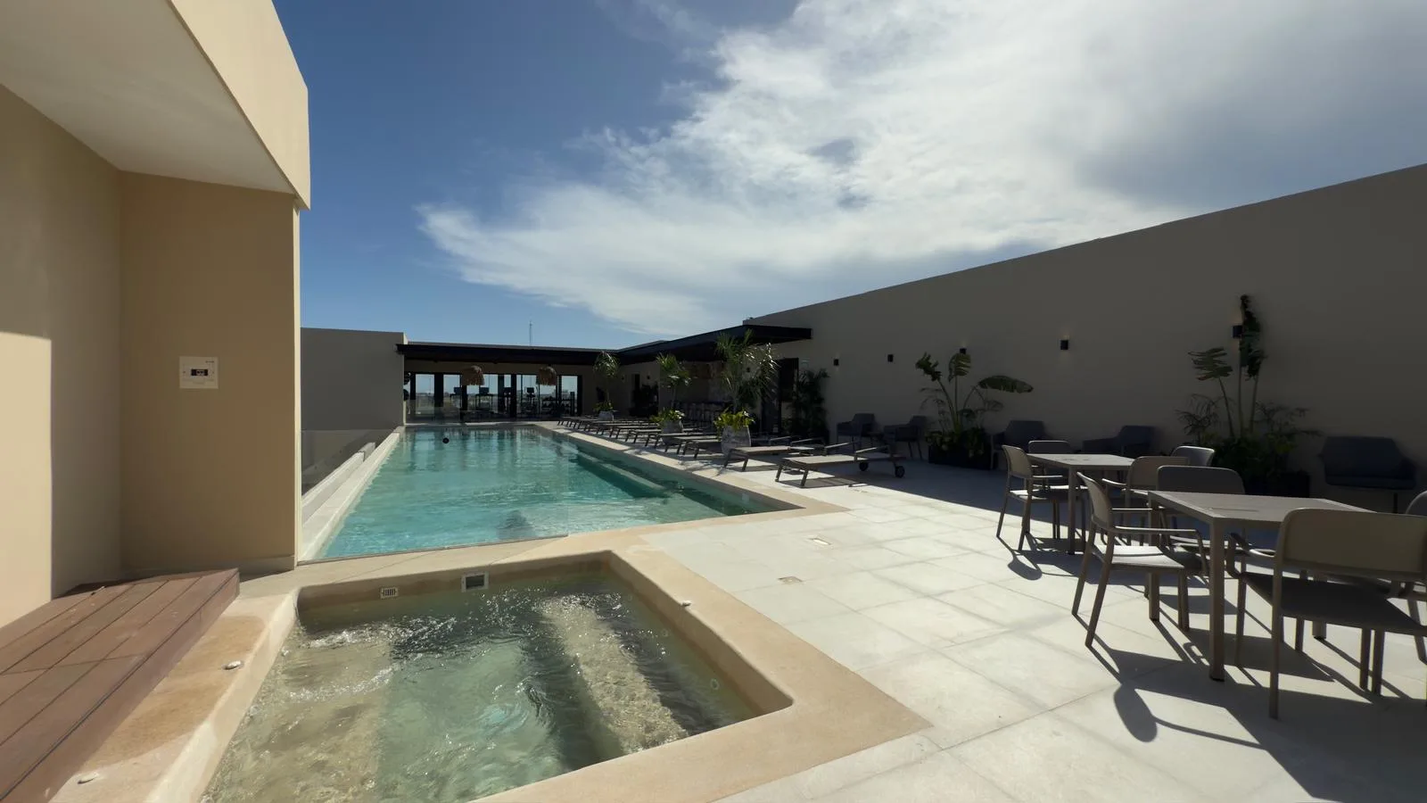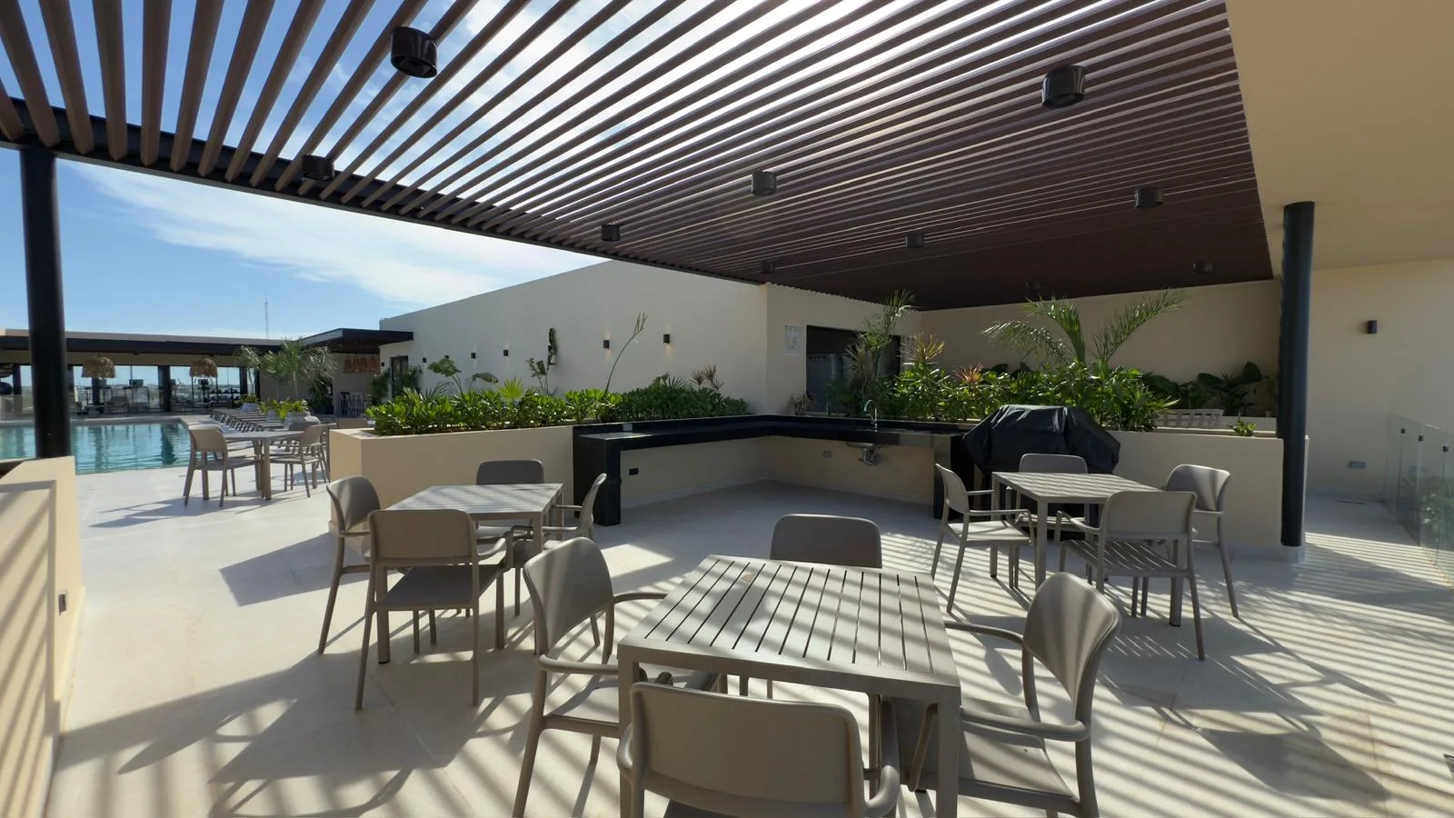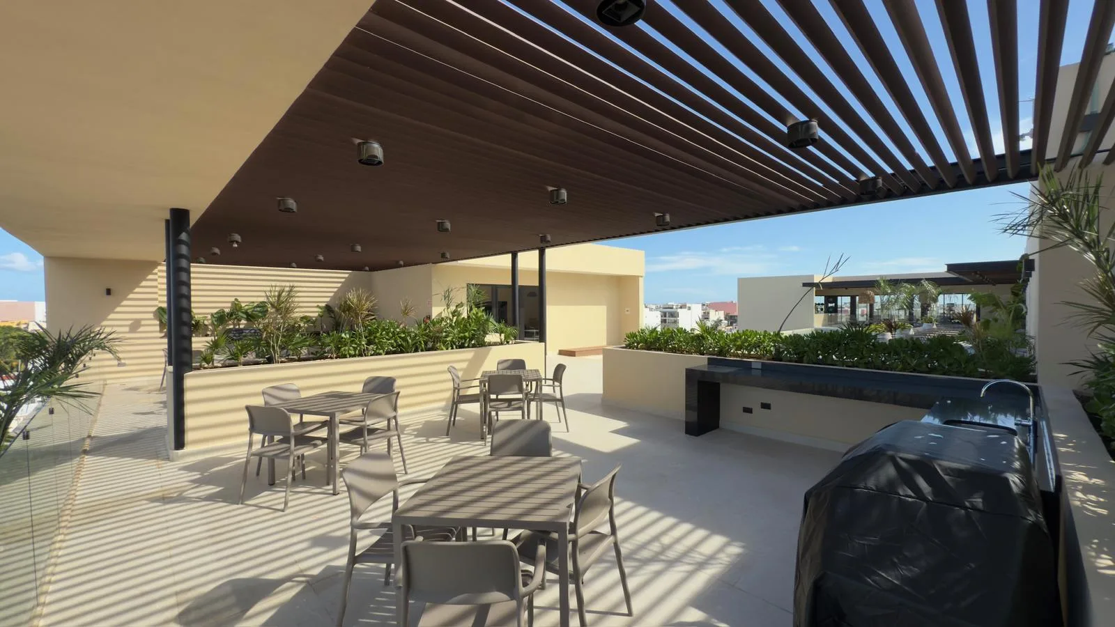 Building amenities include a lobby, storage units, underground parking, an elevator, a rooftop with a swimming pool, a grill area, a gym, and a yoga area, among others.