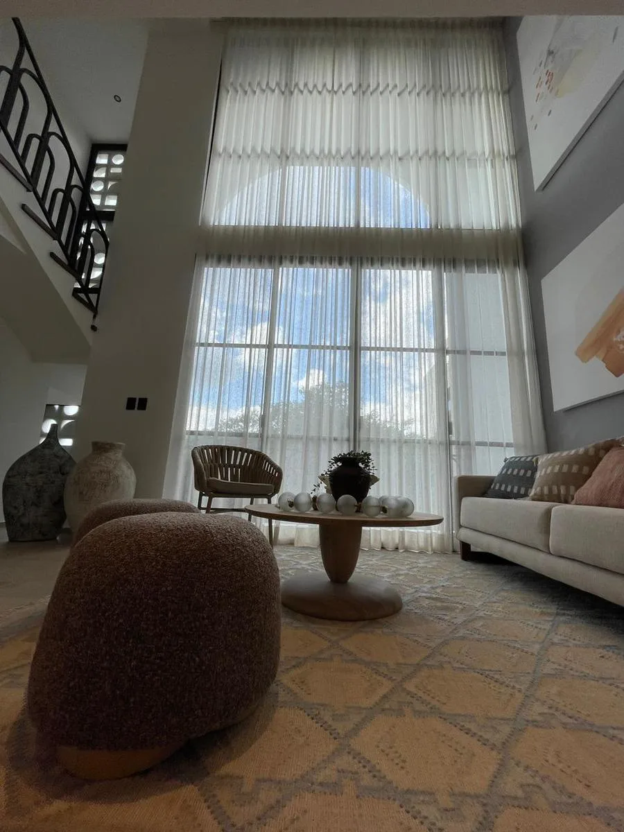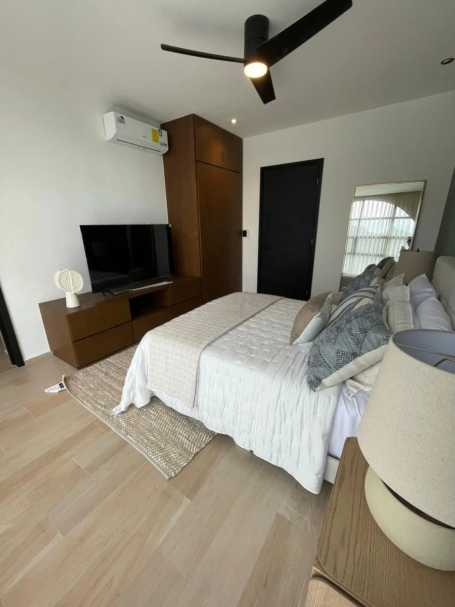 The residence includes one bedroom and one full bathroom. The kitchen is equipped with a ceramic glass cooktop, a range hood, and a refrigerator. Additional features comprise a washer-dryer combination, air conditioning units, ceiling fans, wood carpentry, screened doors and windows, an electric water heater, a 2, 500-liter water tank, and a pressurization system.