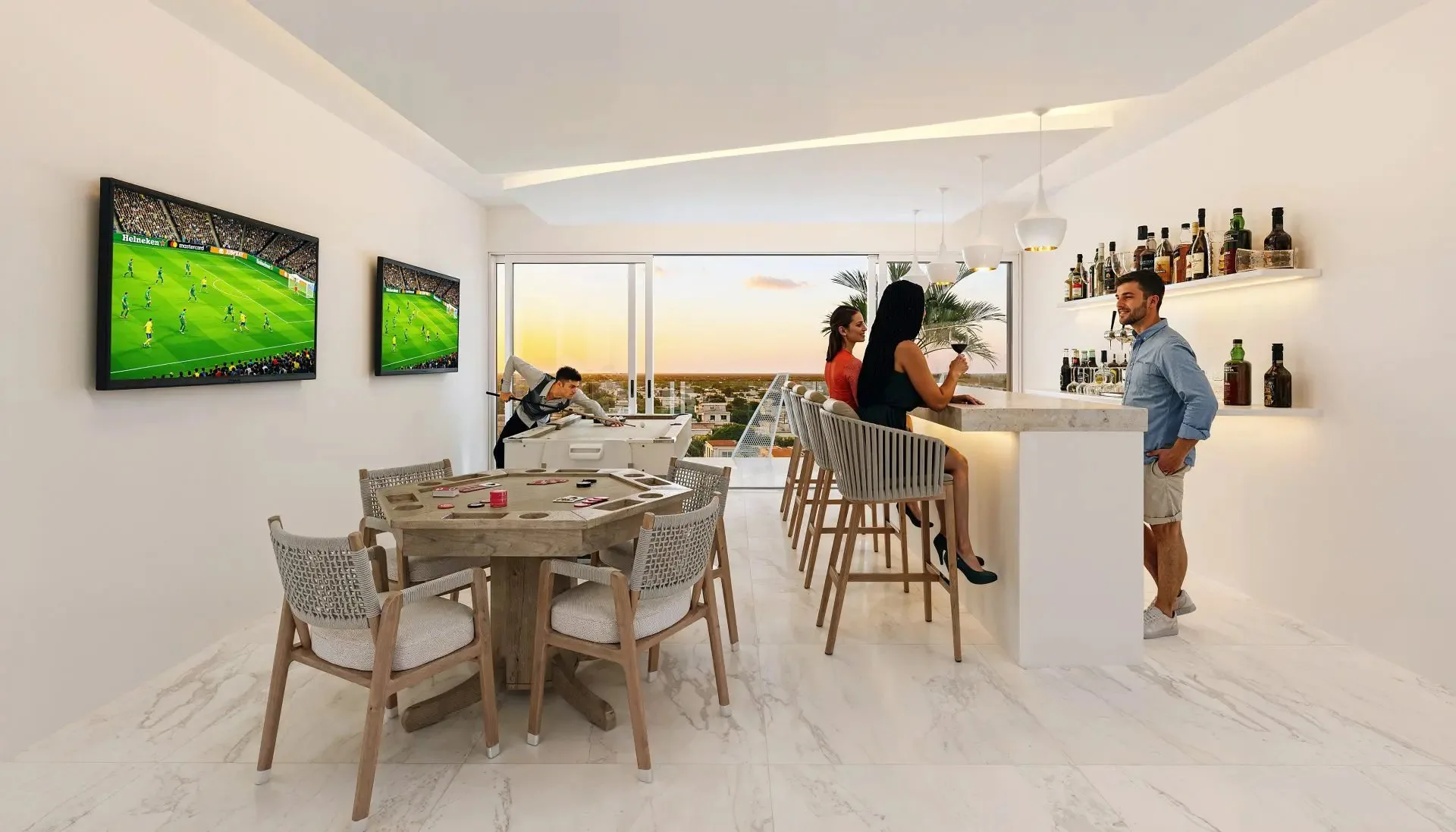 The residence is part of a boutique development. Building amenities include a rooftop area with views of the Caribbean Sea. The rooftop features a sports bar, sun loungers, and a seating area. Private jacuzzis are available in penthouse units. There is a modern, climate-controlled gym and an elegant reception lobby.
