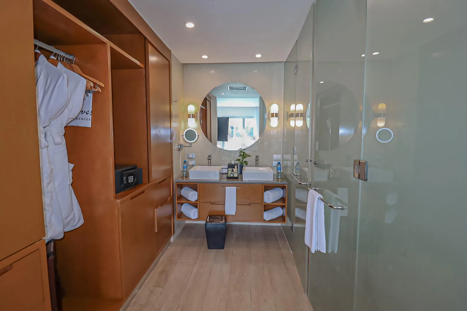Residents have access to extensive amenities including a private beach club, five swimming pools, two infinity pools, fifteen restaurants and gourmet dining spots, five signature bars, and four pool bars. Additional building features consist of a world-class spa, a fitness center, a tennis court, a basketball court, a children's playhouse, a dedicated teen game room, a central plaza, and an on-site coffee shop. Butler service is also available.