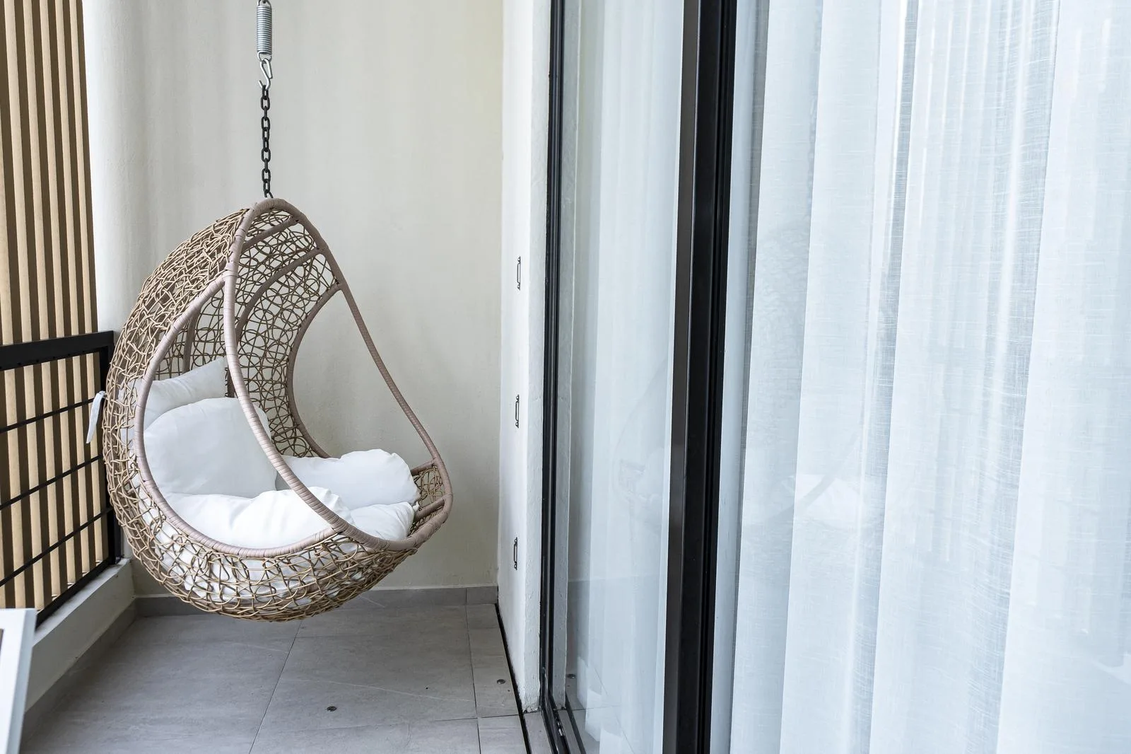 Amenities include a rooftop area with a swimming pool, sunbeds, a rest area with hammocks, and a grill. The building also offers a lobby, parking, laundry facilities, security, and vacation management services. The property is suitable for both vacation rental and long-term occupancy.