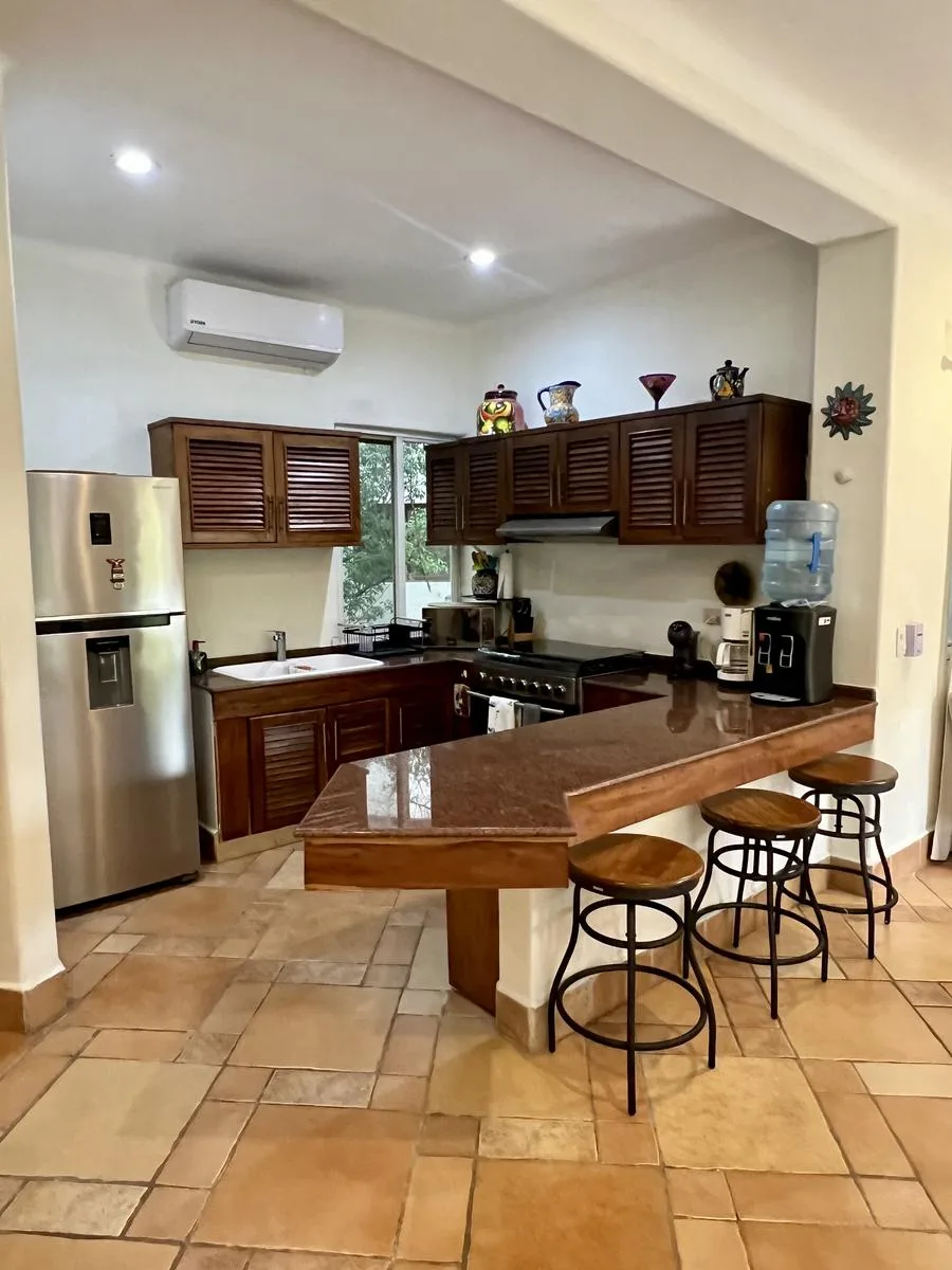 The monthly maintenance fee is $3, 750 Pesos, covering water, gas, pool maintenance, garden, common areas, Pakal, and Playacar.