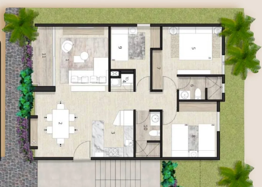 The property is located within a new residential community situated in the south exit of Playa del Carmen, a fast-growing area. The location offers easy access to major avenues and points of interest while providing the tranquility of a secure, gated community surrounded by nature. Each building in the development contains only six apartments, fostering an atmosphere of privacy and comfort.