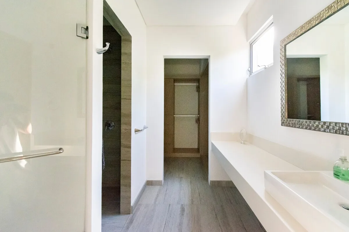 The master bedroom features private access to the balcony, a luxurious en-suite bathroom designed for two, and a spacious walk-in closet. The second bedroom is located separately at the end of the hallway and offers large windows overlooking a bird sanctuary, an en-suite bathroom, and a walk-in closet. The third bedroom also has large jungle-view windows, an en-suite bathroom, and a walk-in closet. The fourth bedroom is designed with two twin beds and playful decor and has access to an adjacent bathroom. A fully equipped laundry room and additional kitchen storage are included.