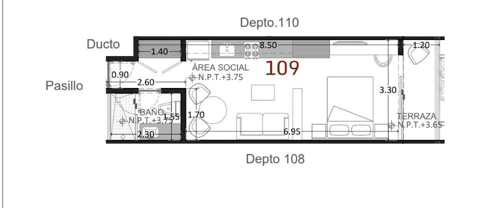 The unit encompasses 34 square meters and contains one bedroom, one bathroom, a living area, and an equipped kitchen. It includes a balcony.