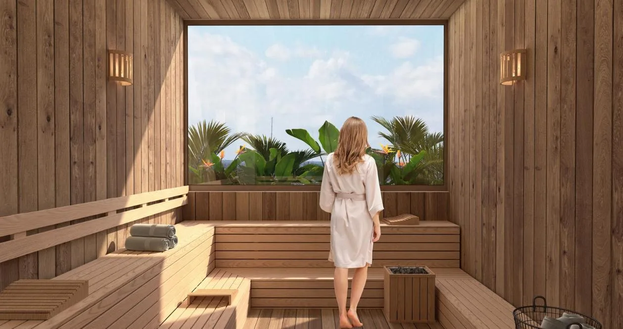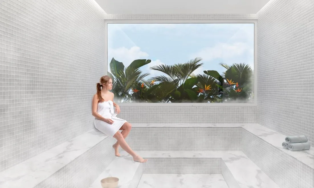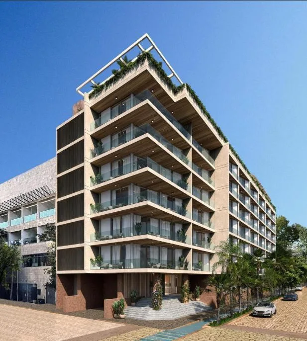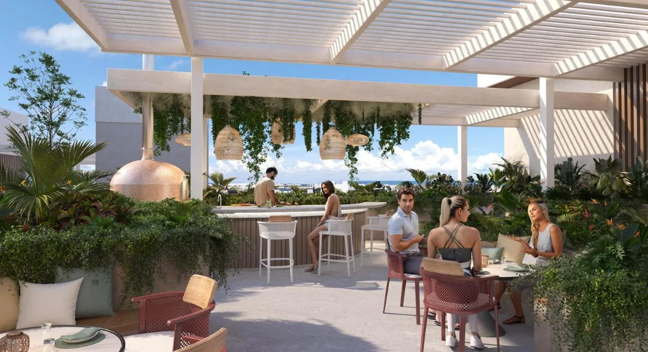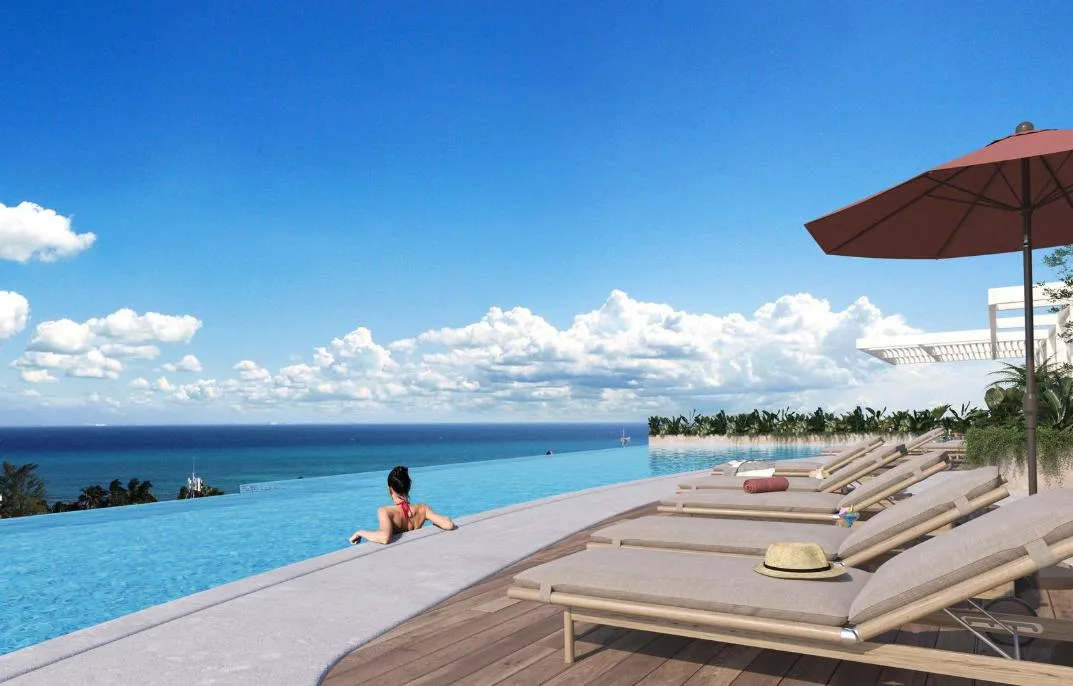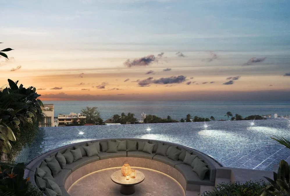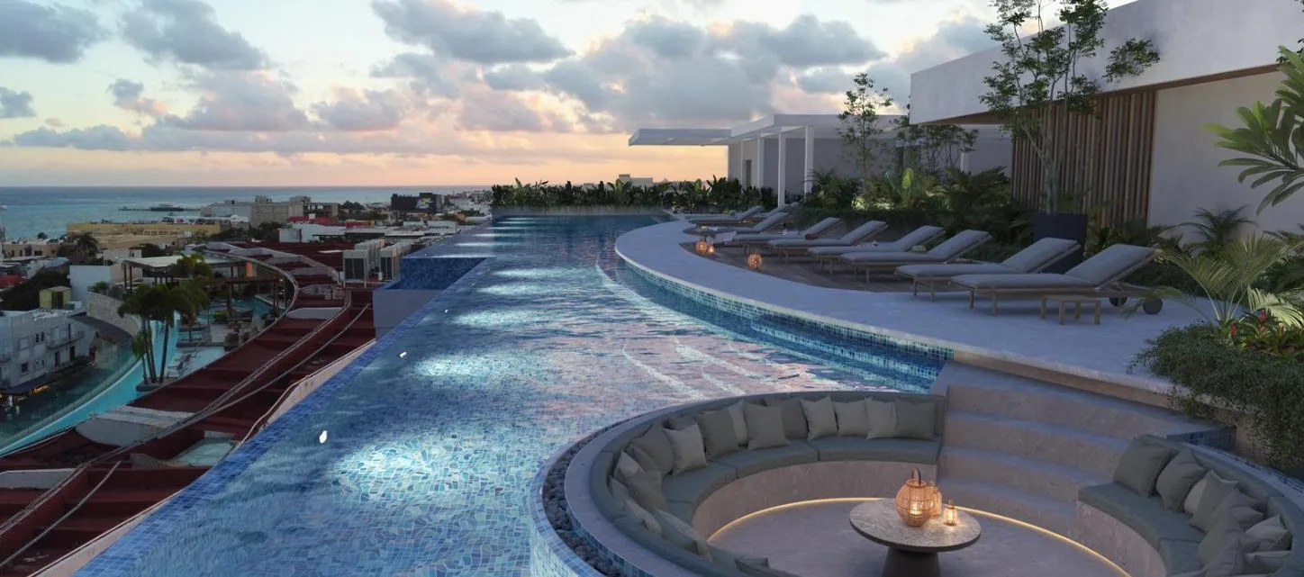 Building amenities include an infinity pool, a lounge area, a pool bar, a Sky Club, a gym, a coworking space, a sauna, a steam room, and a yoga area. The property is located in a central zone with high tourist demand.