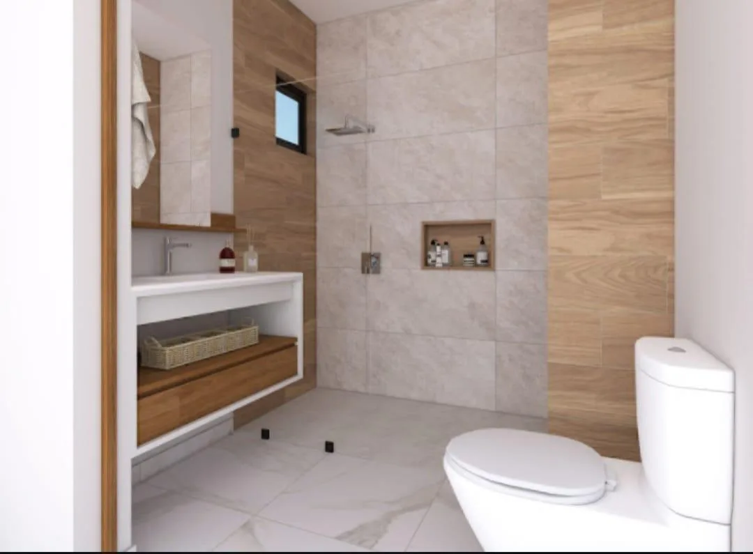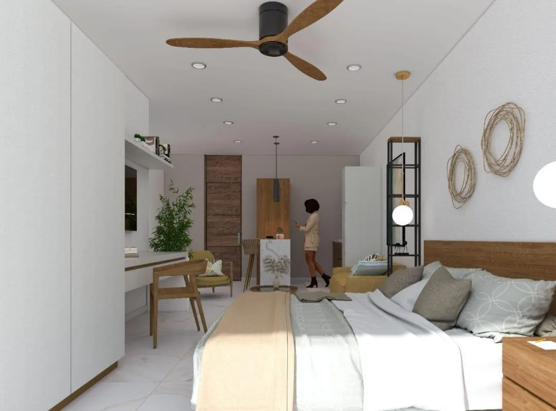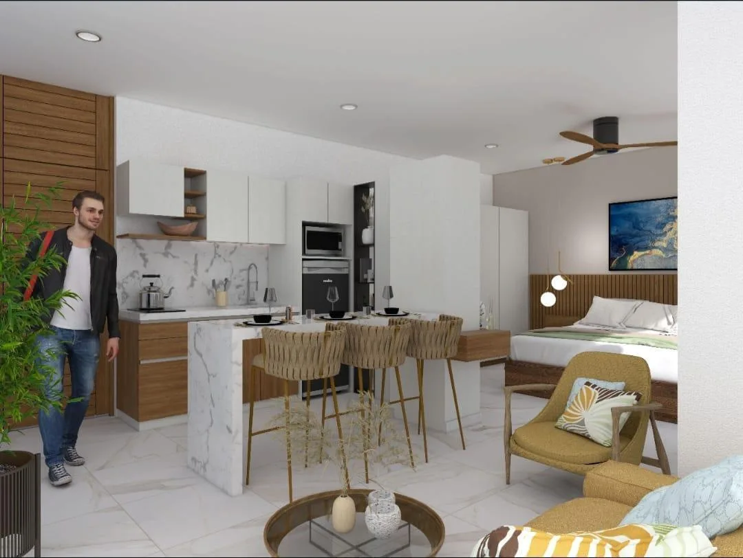The unit features a fully equipped kitchen with white wood and parota cabinetry, an extractor hood, microwave, two bar stools, a 13-foot refrigerator, and a breakfast bar. The bathroom is equipped with a sink, toilet, a cabinet with a drawer, tempered glass, and a mirror with lighting.