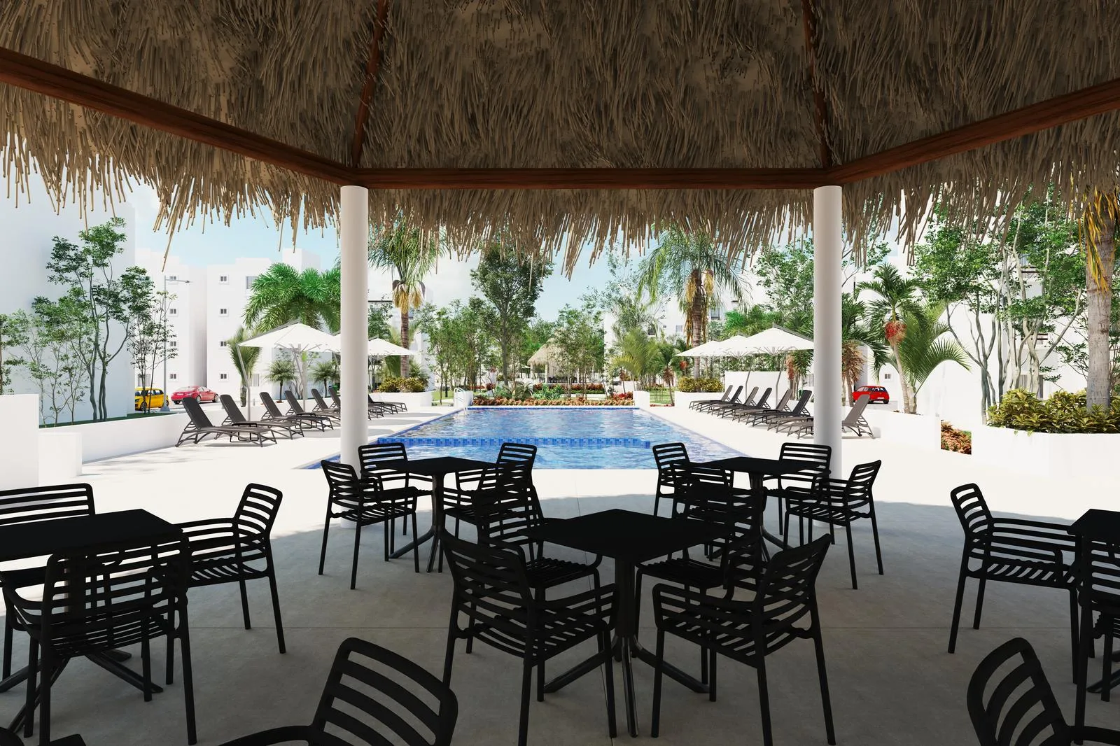 Building amenities include a swimming pool with a shallow section, a solarium, a palapa, walking paths, and a pet park. One assigned parking space is provided per unit.