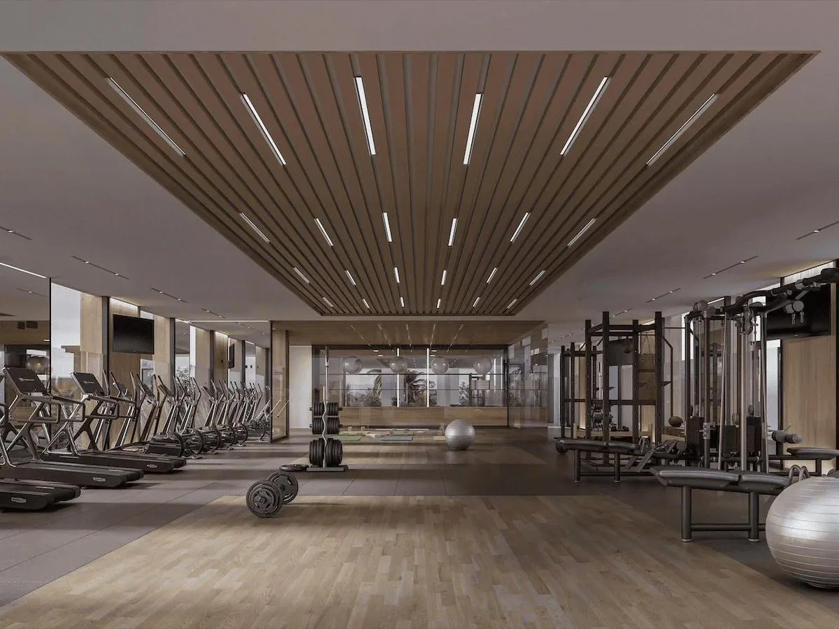 The residential clubhouse includes a bar and restaurant, an adult swimming pool with a swim lane, a playroom, a teen lounge, a spa with steam room and jacuzzi, and a fully equipped gym.