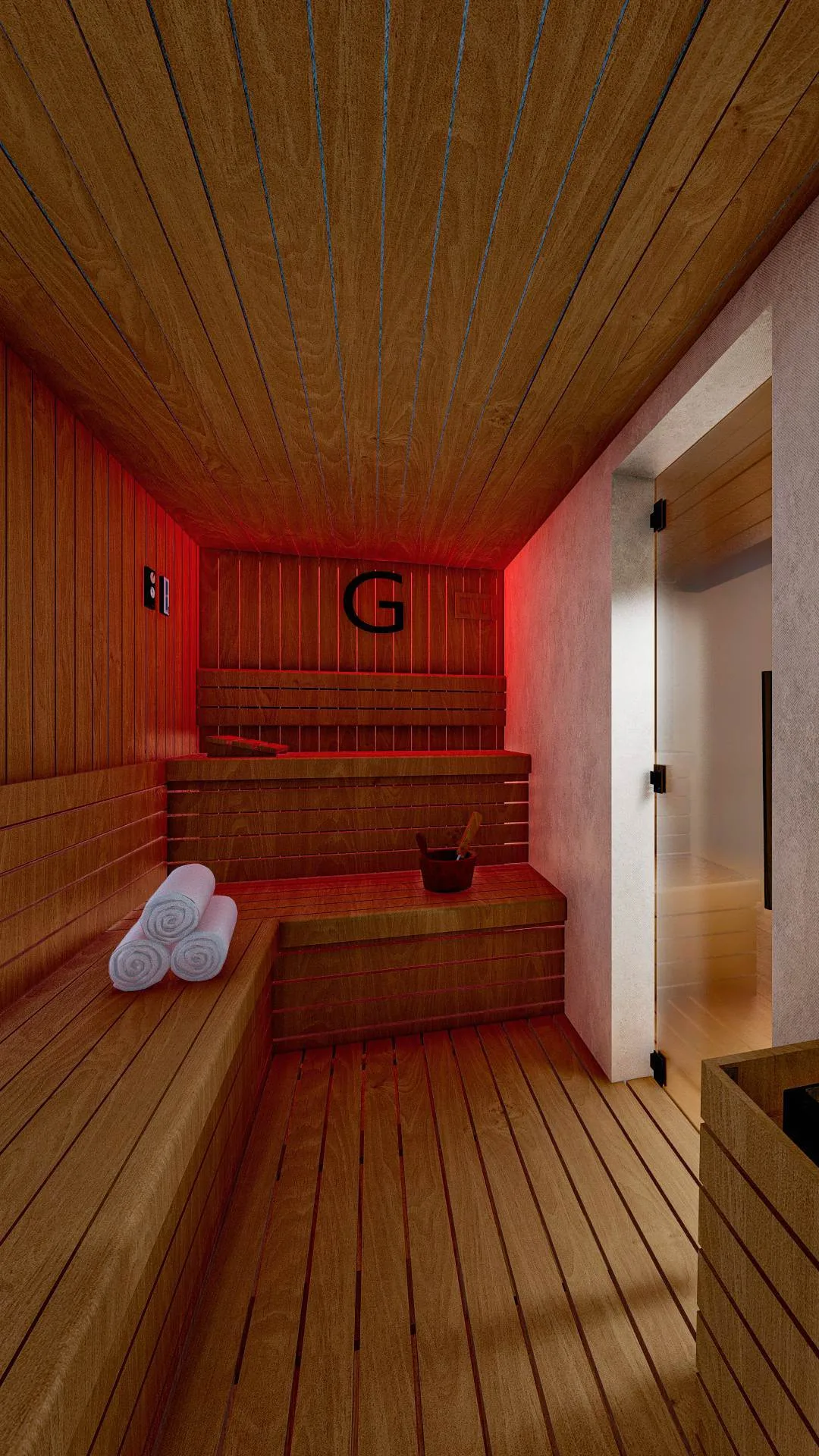 Building amenities include a sky pool, sun loungers, a barbecue area, a rowing area, a sauna, a gym, coworking space, parking, and security.