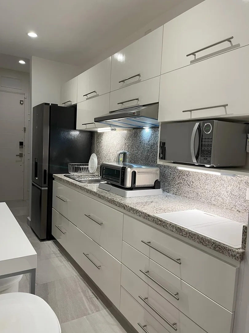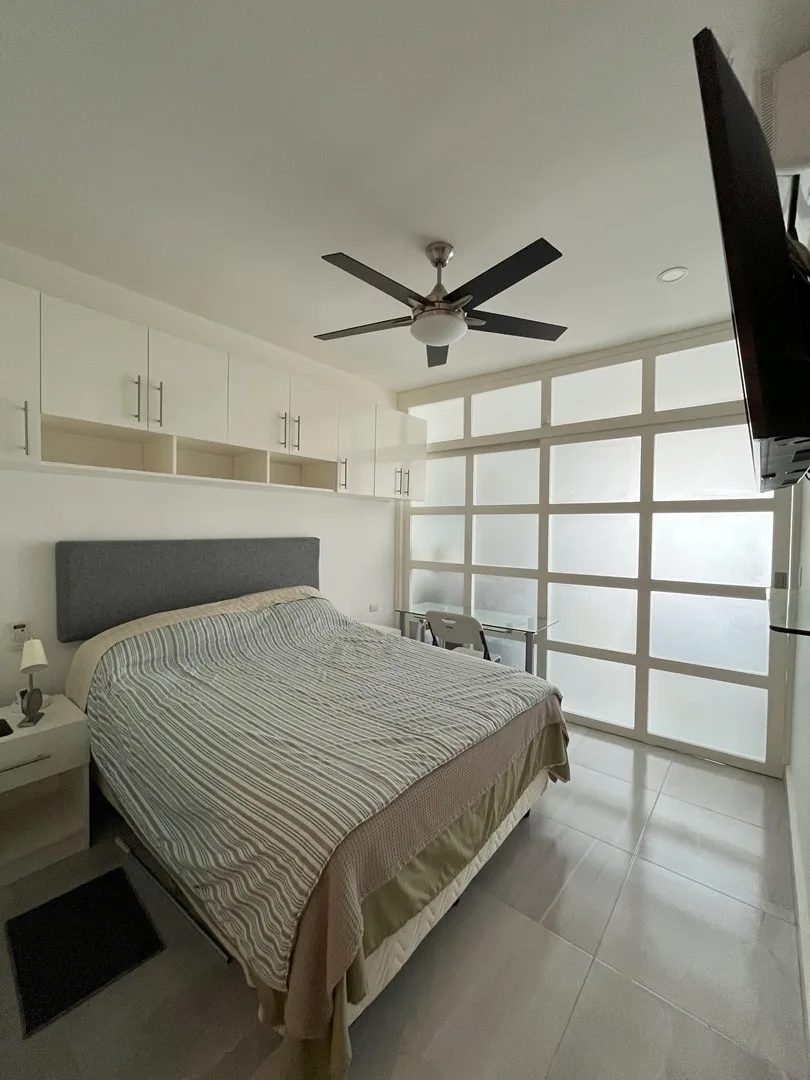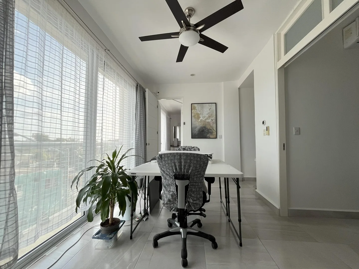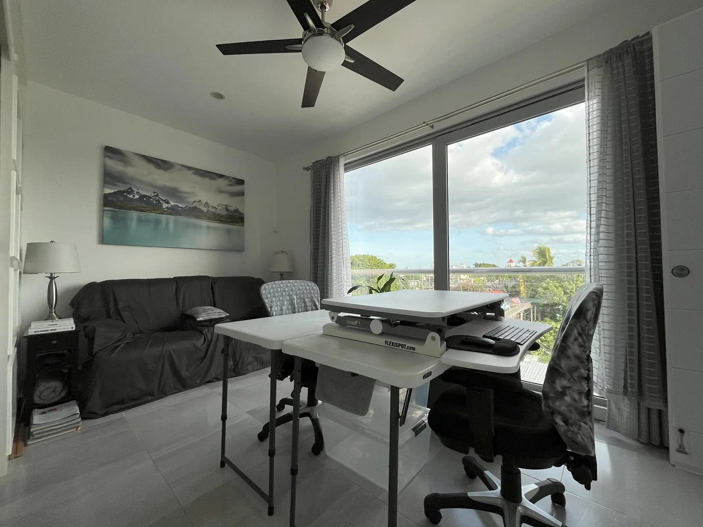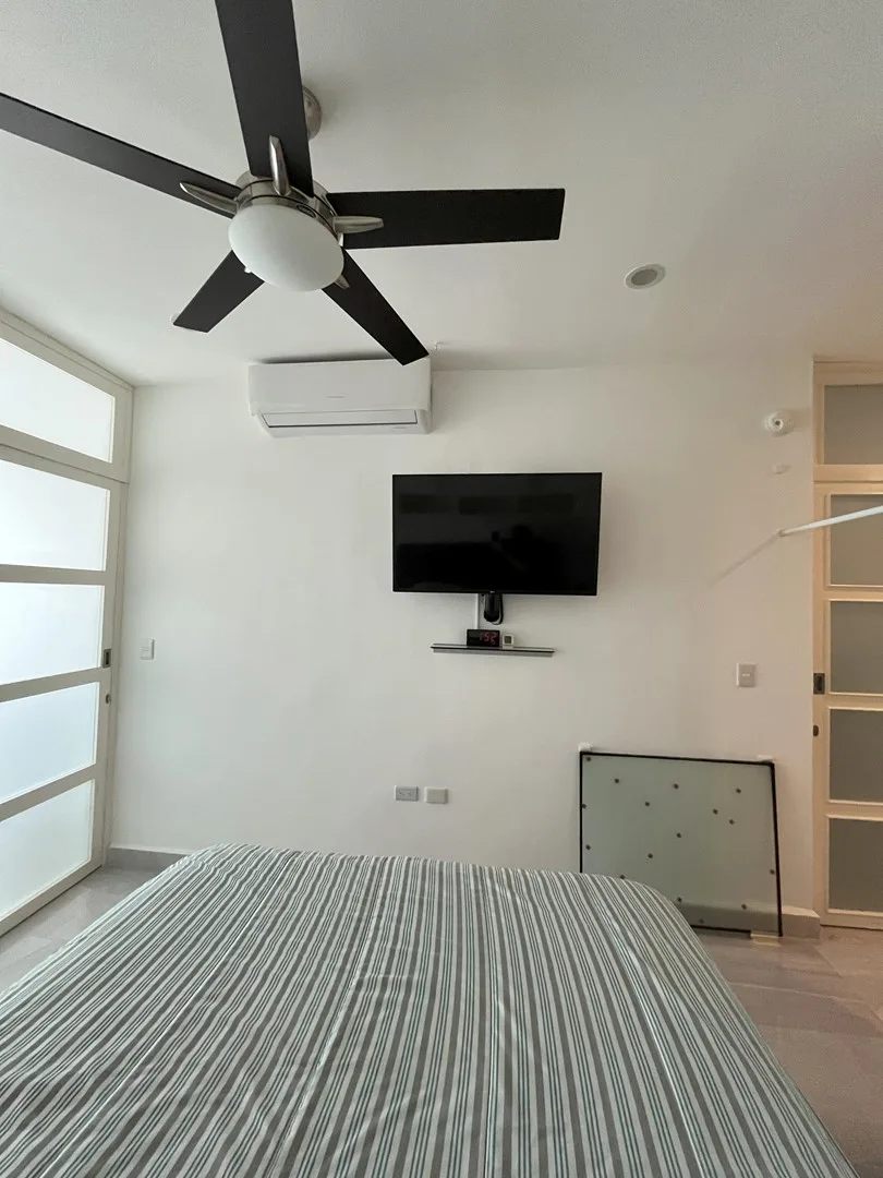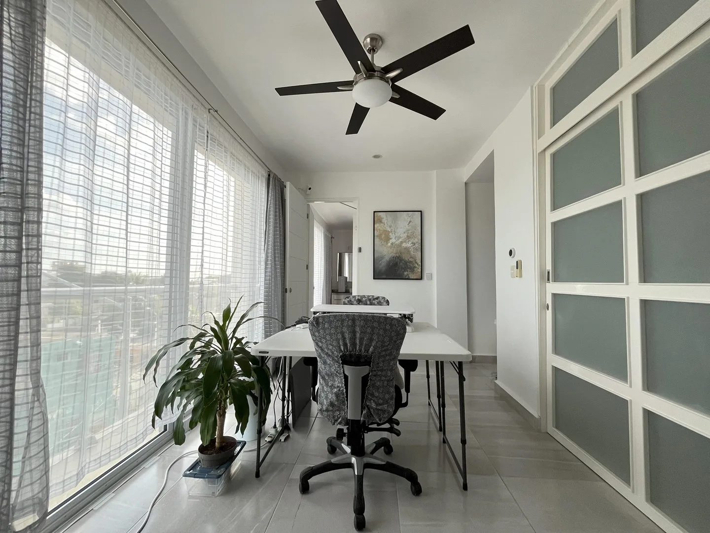 Situated on a one-way residential street, this condominium offers a tranquil living experience away from the busier tourist areas of Playa del Carmen. The building, completed in 2020, is the tallest in several surrounding blocks and features a rooftop equipped with a swimming pool, a solarium, and a lounge area offering spectacular views of sunrises, sunsets, and the ocean.