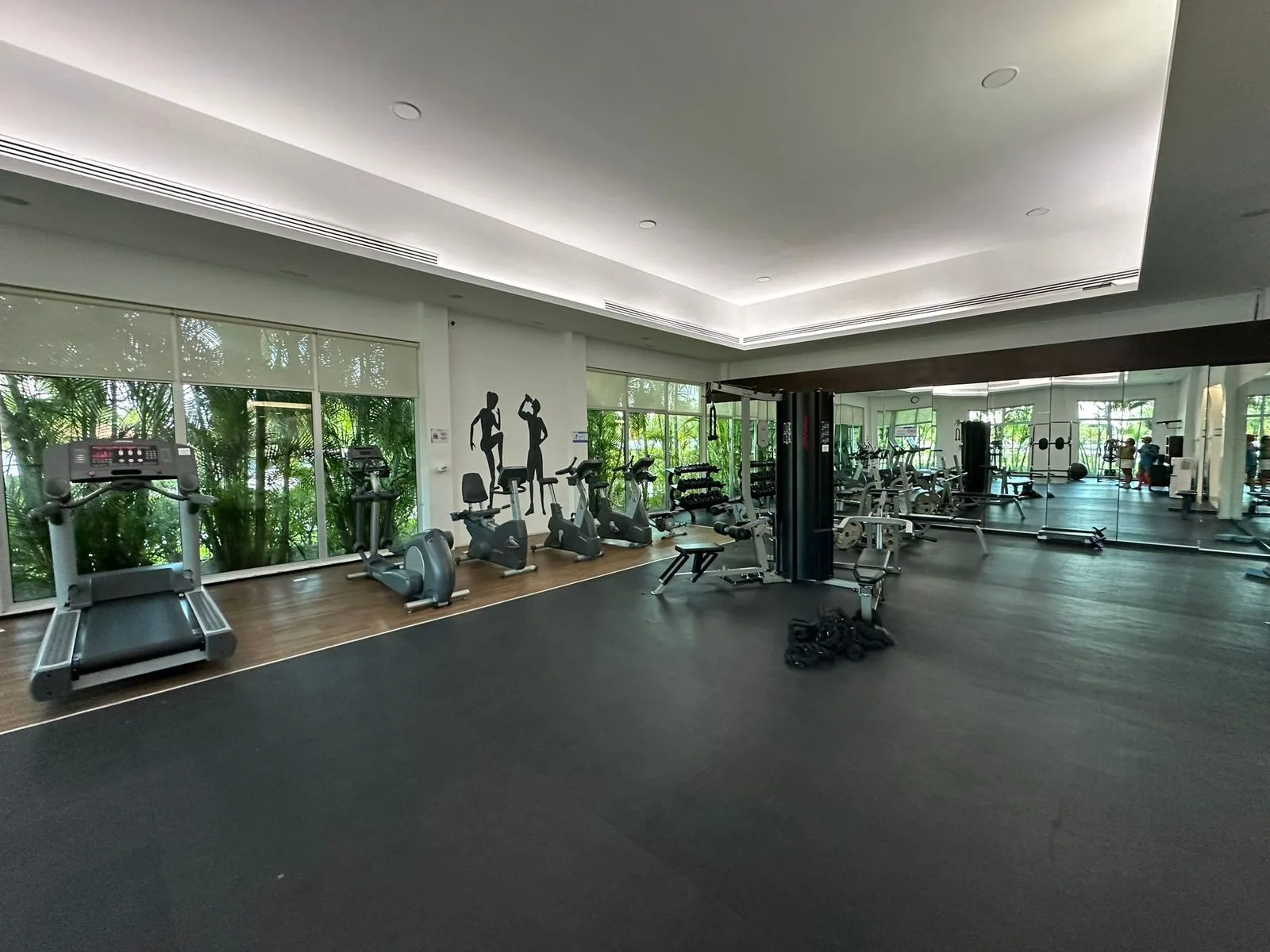 The residential complex offers extensive amenities, including a semi-Olympic swimming pool, a gymnasium, two tennis courts, and a padel court. On-site facilities also include two restaurants and a mini-market.