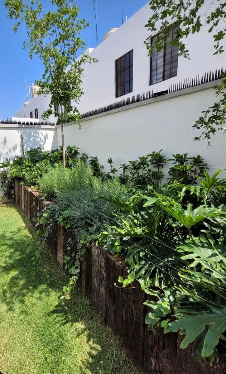Additional amenities include a larger and more efficient water heater. The landscaped garden features a raised bed with sleepers and three trees. Mirrors with integrated lighting are installed in all three bathrooms, the dining room, and on the stairs. Custom carpentry furniture is found in the kitchen and one bathroom. Curtains are provided in the bedrooms, living room, dining room, and kitchen. The entrance is secured with a solid wood door of excellent quality. The home is prepared for air conditioning and includes an irrigation system for the garden and raised bed.