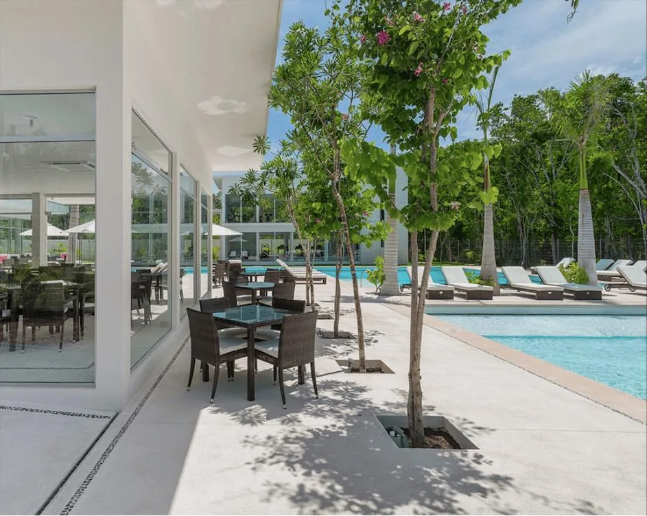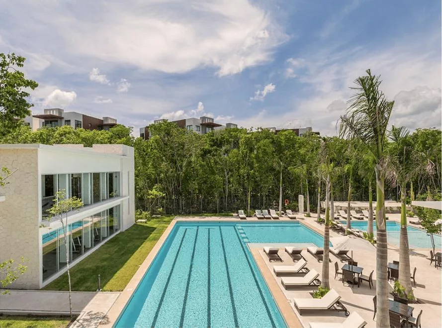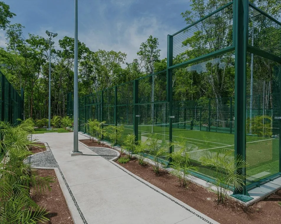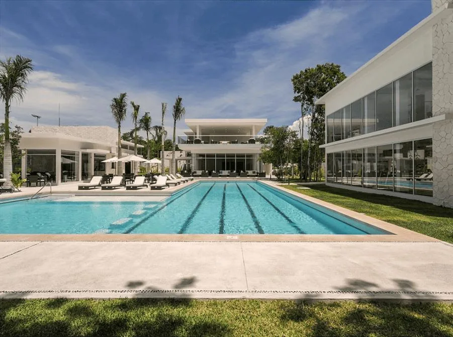 Community amenities include a clubhouse with separate pools for children and adults, a swimming lane pool, a restaurant and bar, an event hall, tennis and paddle courts, and a fully equipped gym. Additional features include sports courts, walkways, and bike paths integrated into green areas, along with themed parks designed for pets, children, and cenotes.