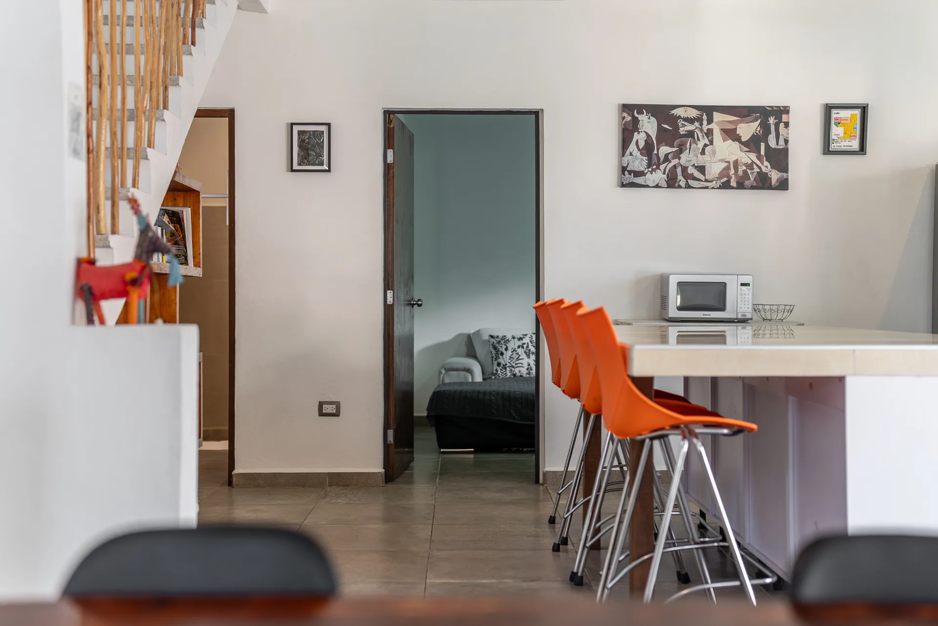 The first floor accommodates three bedrooms, a full bathroom, and a versatile space that can serve as an additional entertainment or play area.
