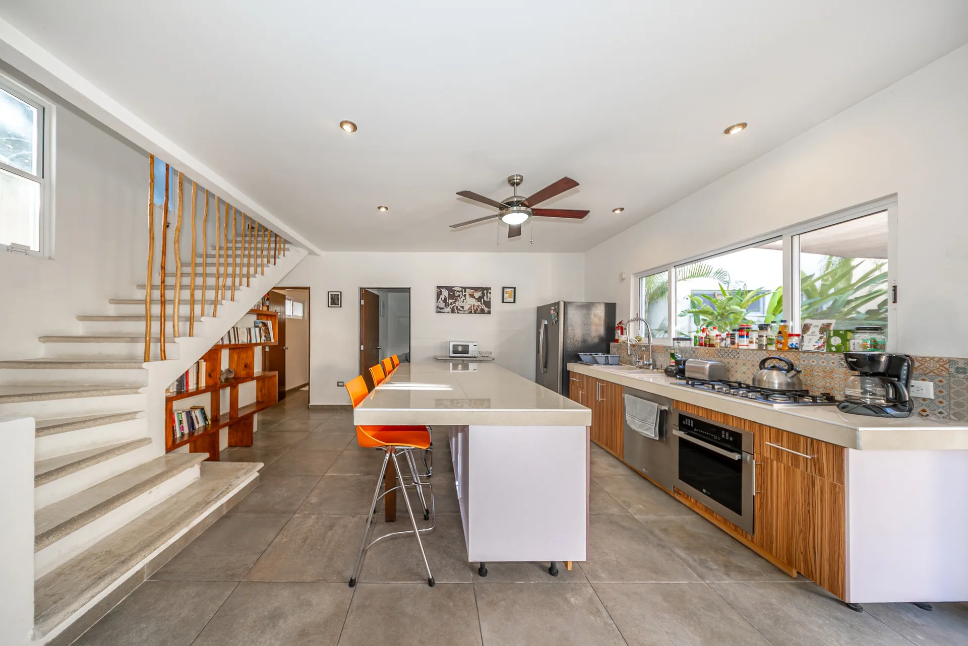 The ground floor of the main house offers an open-concept layout combining the living and dining areas with a kitchen featuring an oversized central island. This level also contains a full bathroom and a bedroom currently utilized as a family room.
